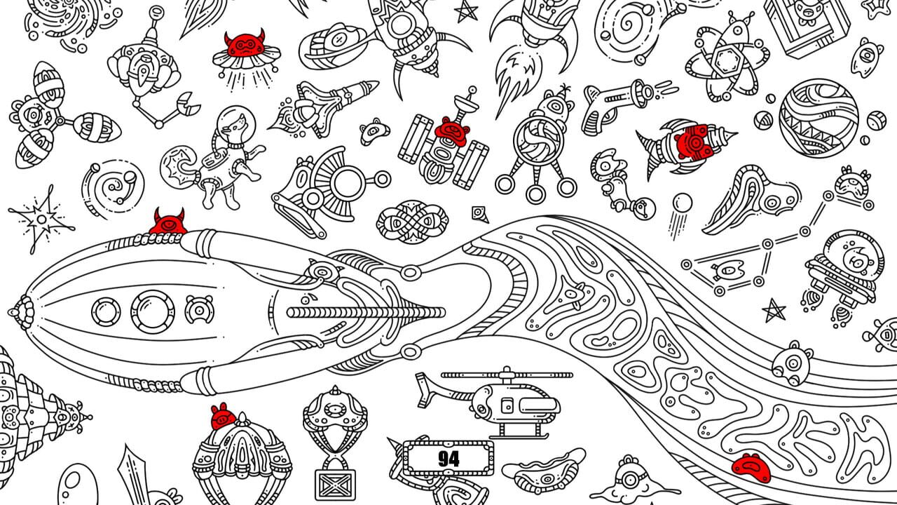 Hidden object game in the cosmic setting. Black and white hand-drawn graphics in a cartoon style. Game for all ages.