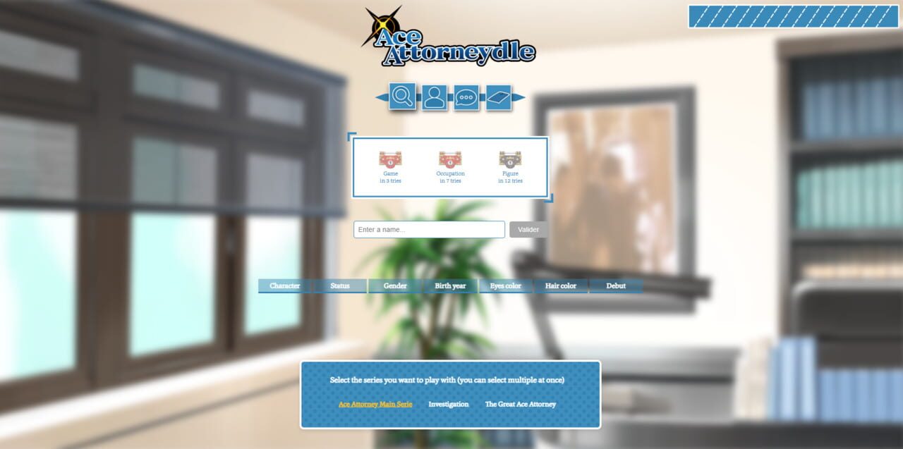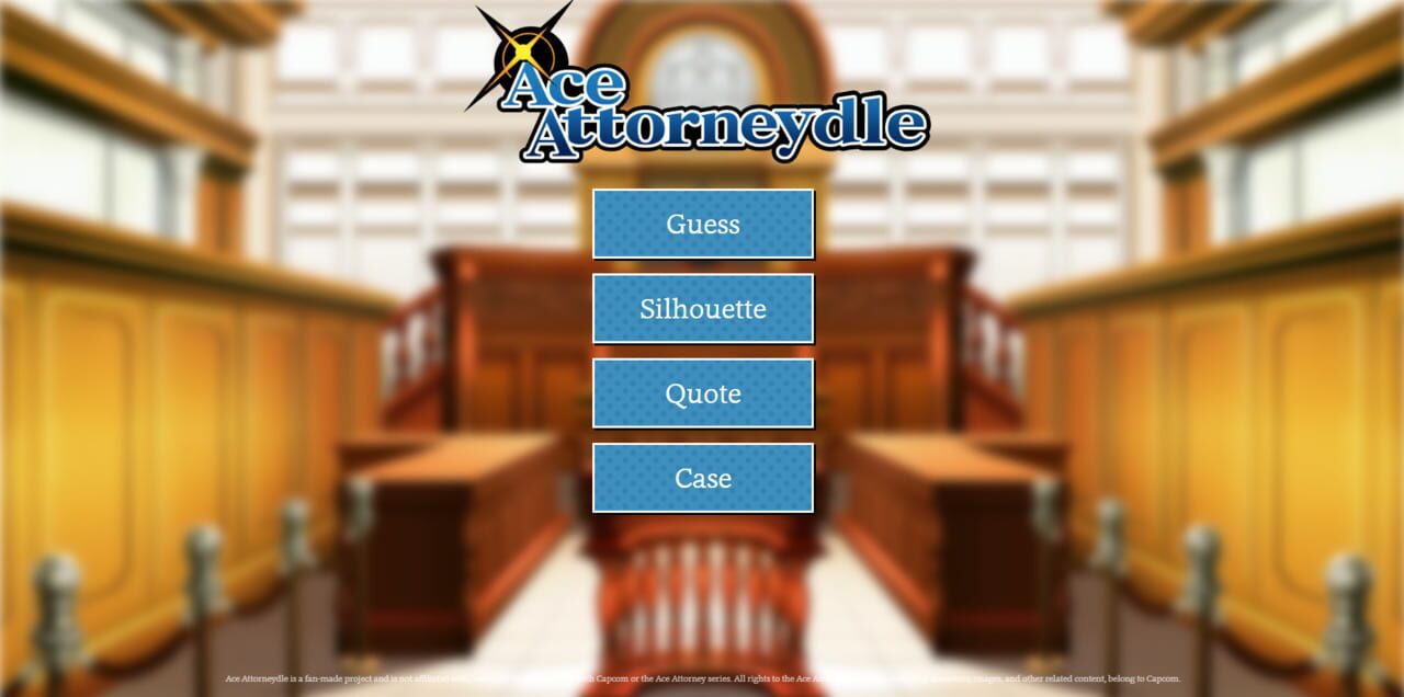 Inspired by popular daily games like Wordle, Gamedle, or Loldle, Ace Attorneydle is a guessing game set in the Ace Attorney universe. It features various modes, such as character, silhouette, quote, or case. Players can test their knowledge of Ace At...