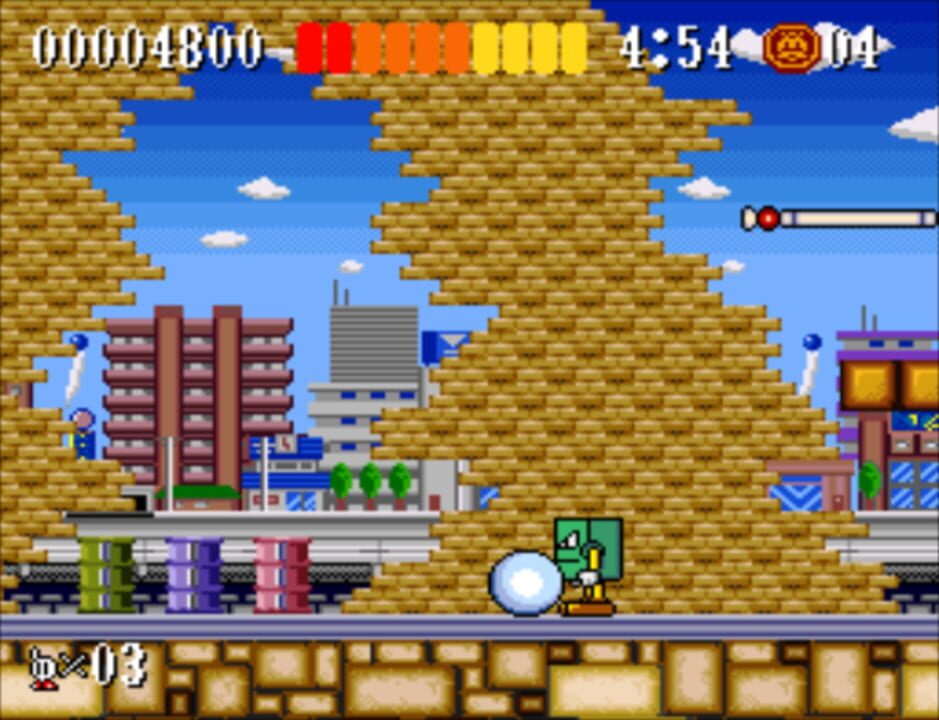 The player takes control of a white Pachio and tries to make his way through all the side-scrolling levels. In between each level is a cut scene that updates the story for the player. Players can collect coins in the game; collecting 100 of them resu...