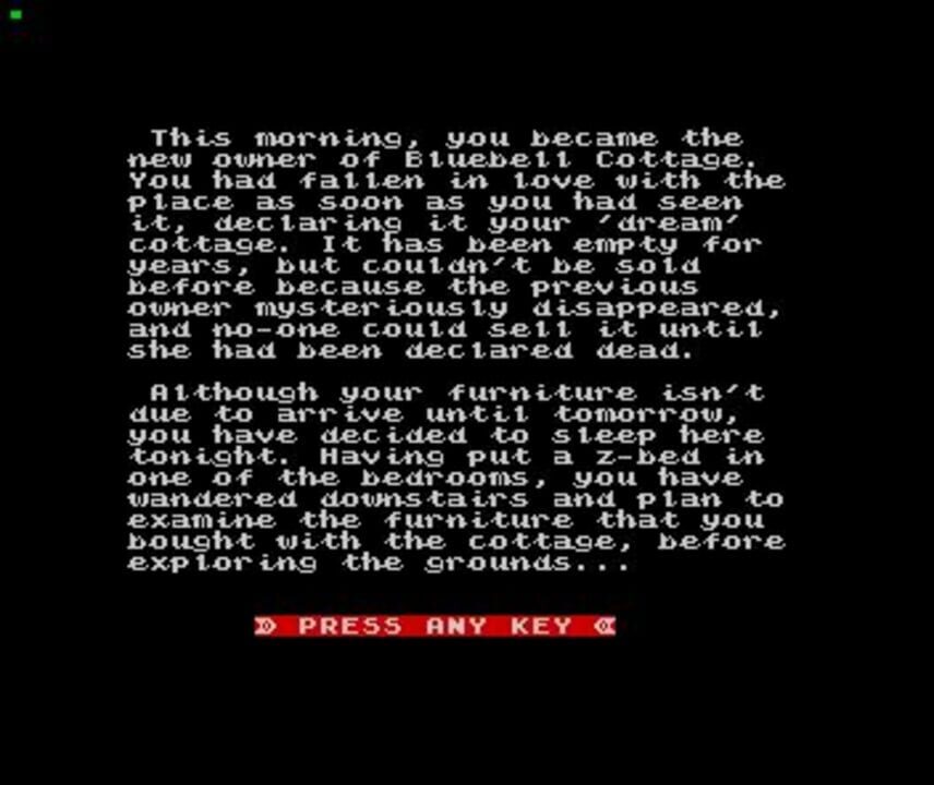 A text adventure written by Linda Wright. The player takes the role of someone who has just become the proud owner of a country cottage. It's not been live in for ages, because the previous owner disappeared - vanished without a trace, so it's in a ...