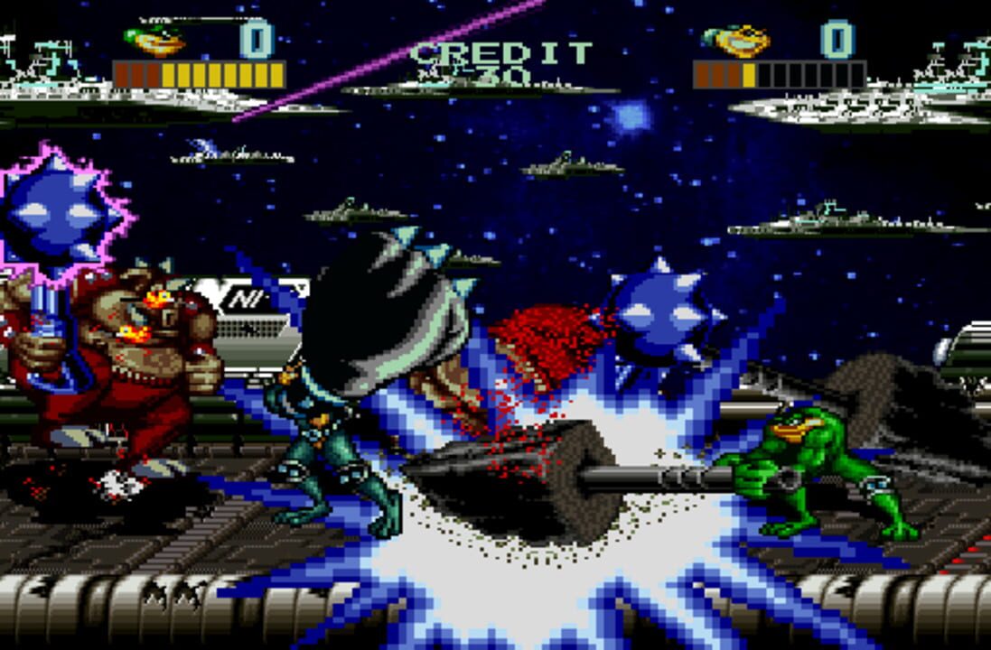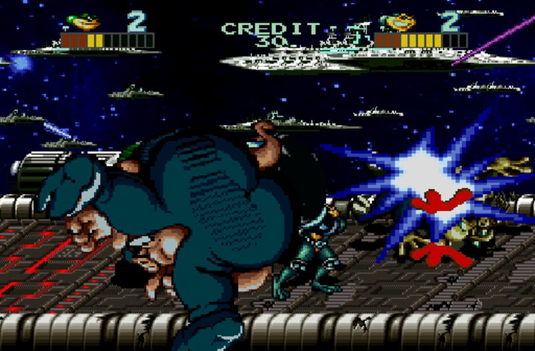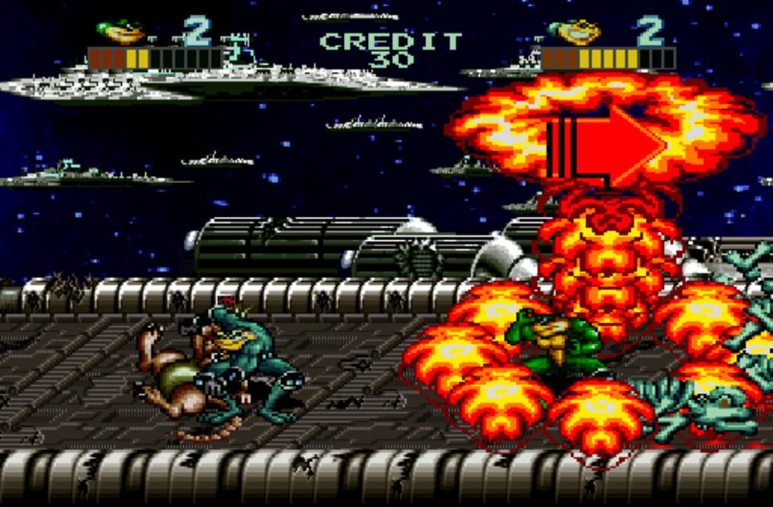 Up to three players, as the Battletoads, brawl aliens and mutant rodents through six levels to save the universe from the Dark Queen. The game also includes vertical and bonus levels. Each Toad has its own signature attack, and as customary for the s...