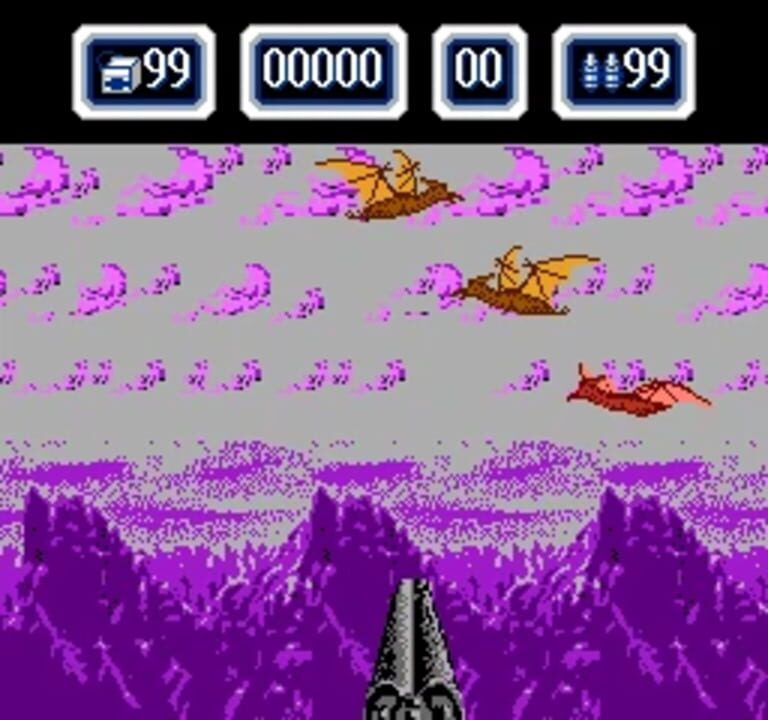 An unlicensed shooter from Inventor for the Famicom, allowing players to choose from 6 different stages of dinosaur action. Compatible with the NES zapper.