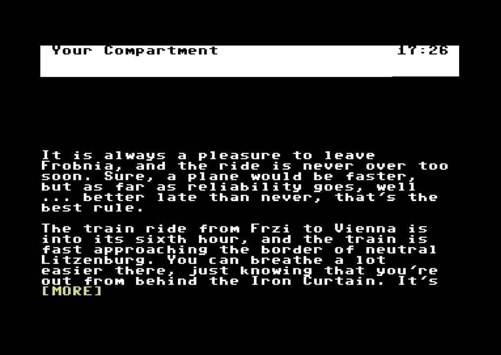 Border Zone is a text adventure game in which the player controls three different protagonists throughout three chapters