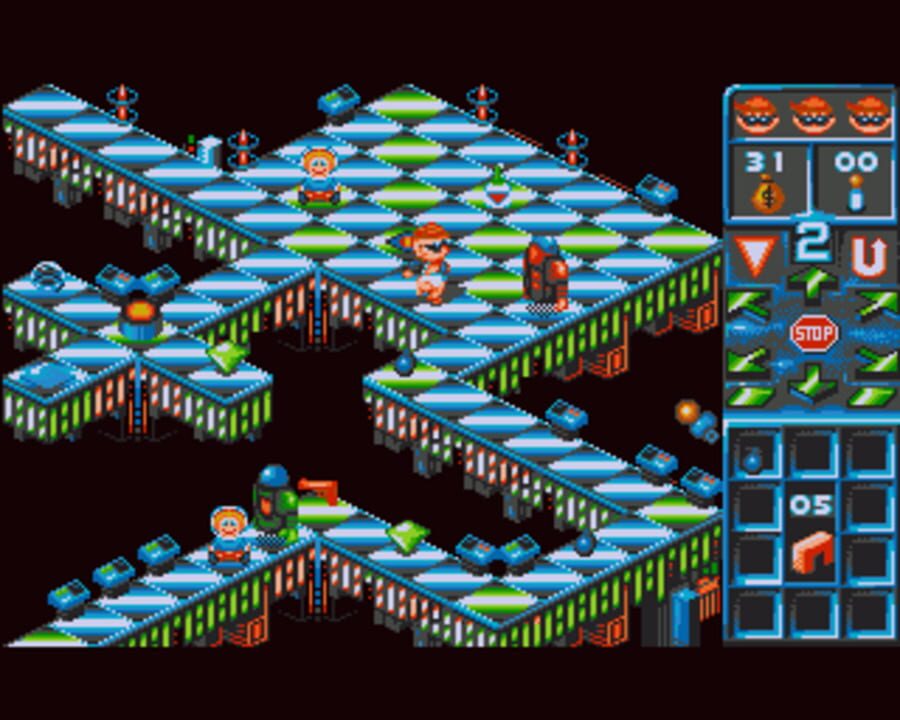 Brat is an isometric action puzzle in which the player guides Nathan, the brat of the title, through a series of twelve levels. The isometric landscape scrolls up-screen, imposing a time limit on each level. Whilst Nathan automatically walks forwards...