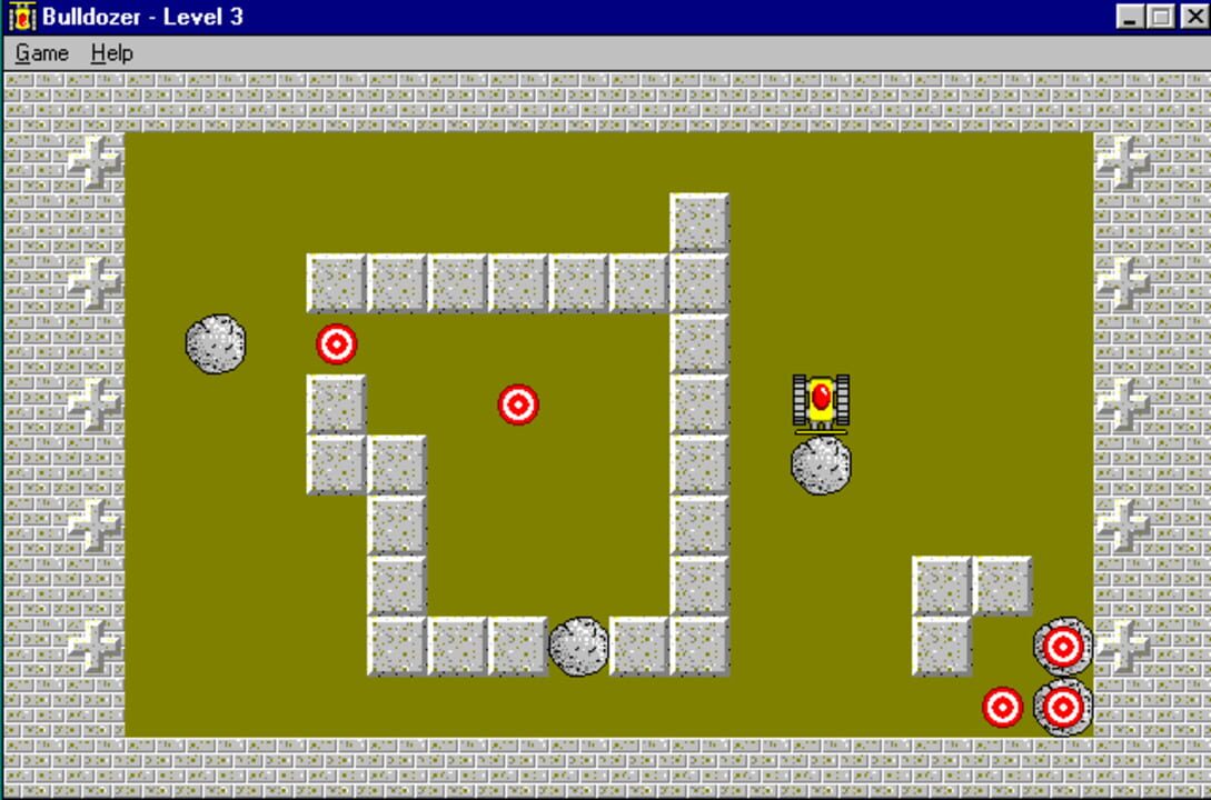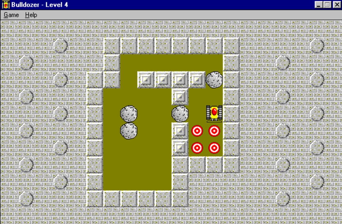 The player drives the eponymous Bulldozer and must push rocks onto targets. The vehicle is driven via the arrow keys. There are sixty levels in the game. Every four levels the player is given a password which allows them to restart at that point.