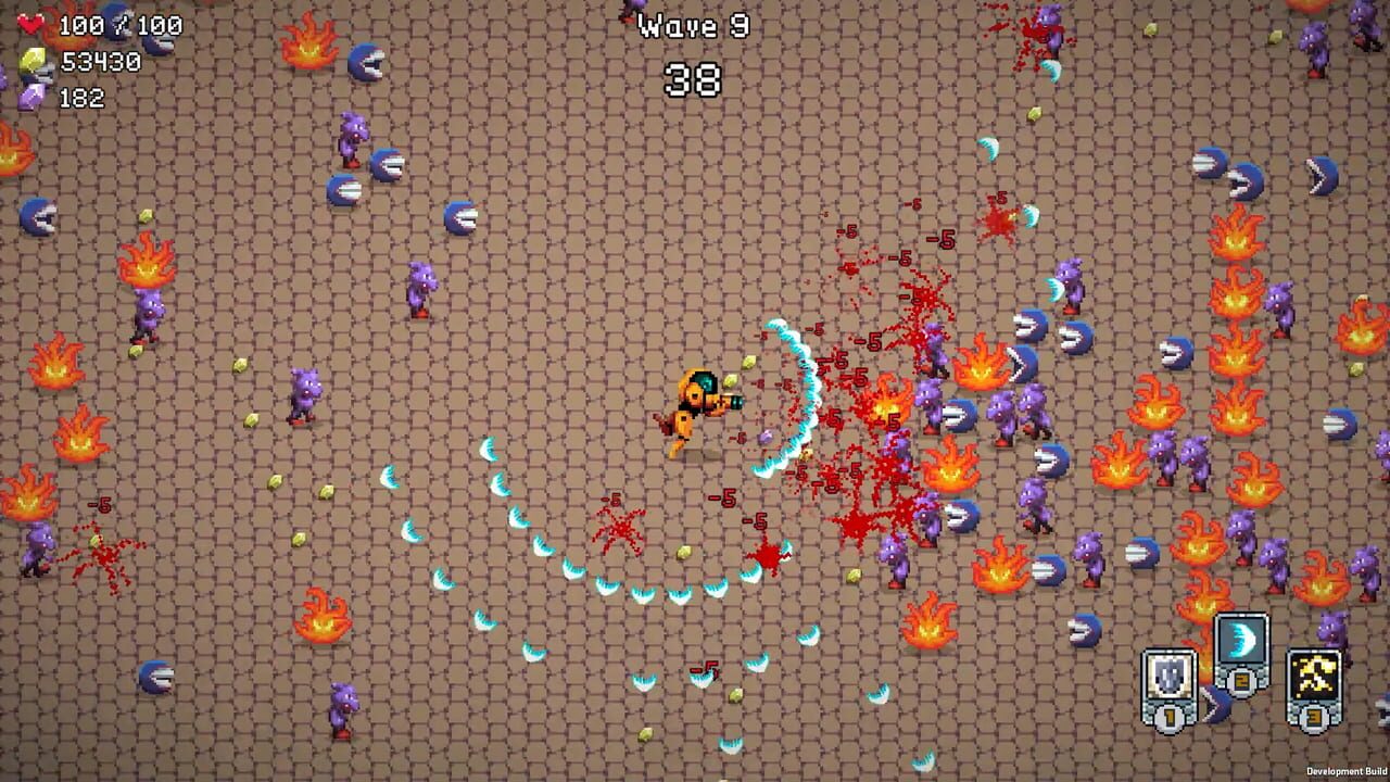 Cards and Guns is a top-down arena shooter roguelite, where you’ll have to defeat hordes of creatures. Choose from a variety of cards and upgrades to create unique builds and survive to the end.