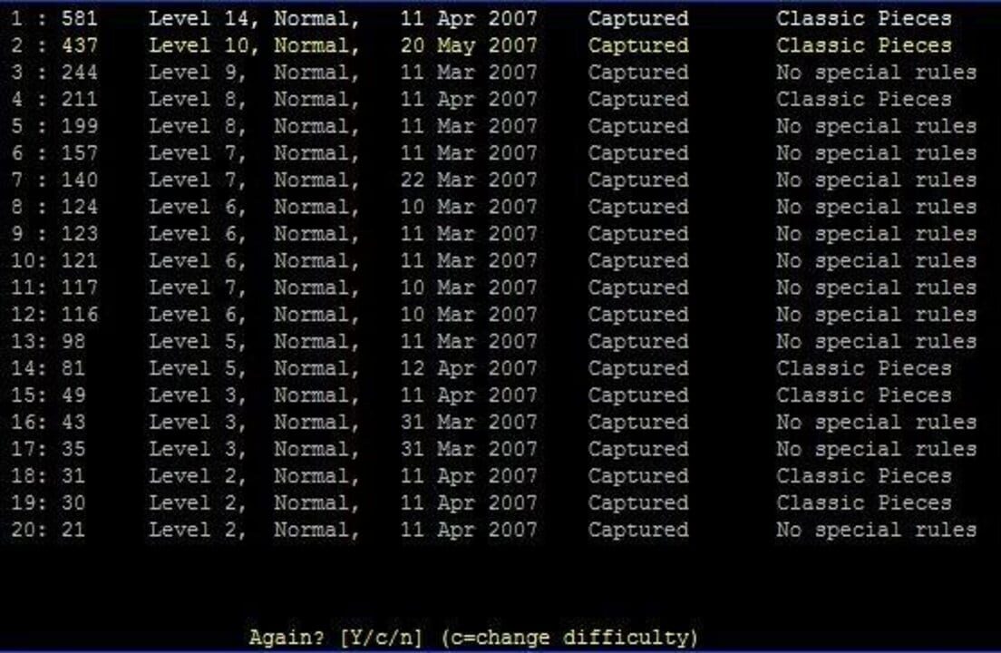 ChessRogue is a console-based puzzle game loosely based on chess. You take the part of the sole survivor of your side, and battle through twenty-five levels to capture the opposing King. As you capture opposing pieces, you learn their tricks and beco...