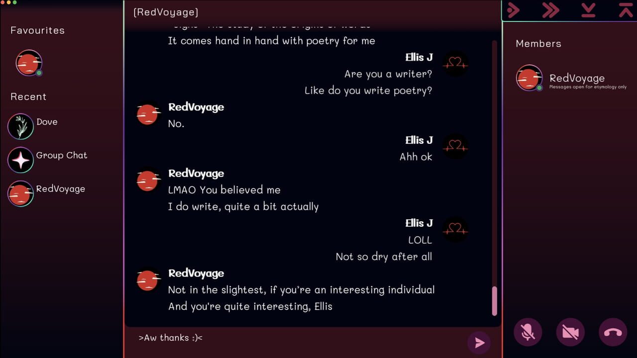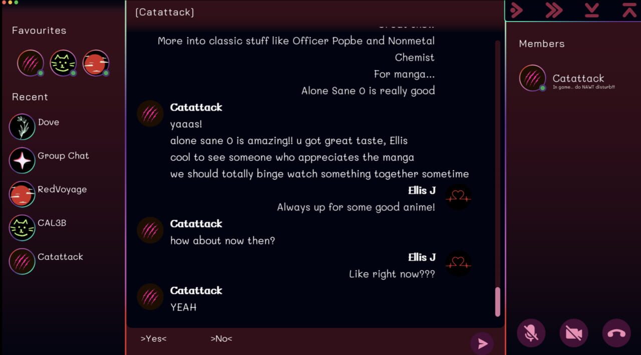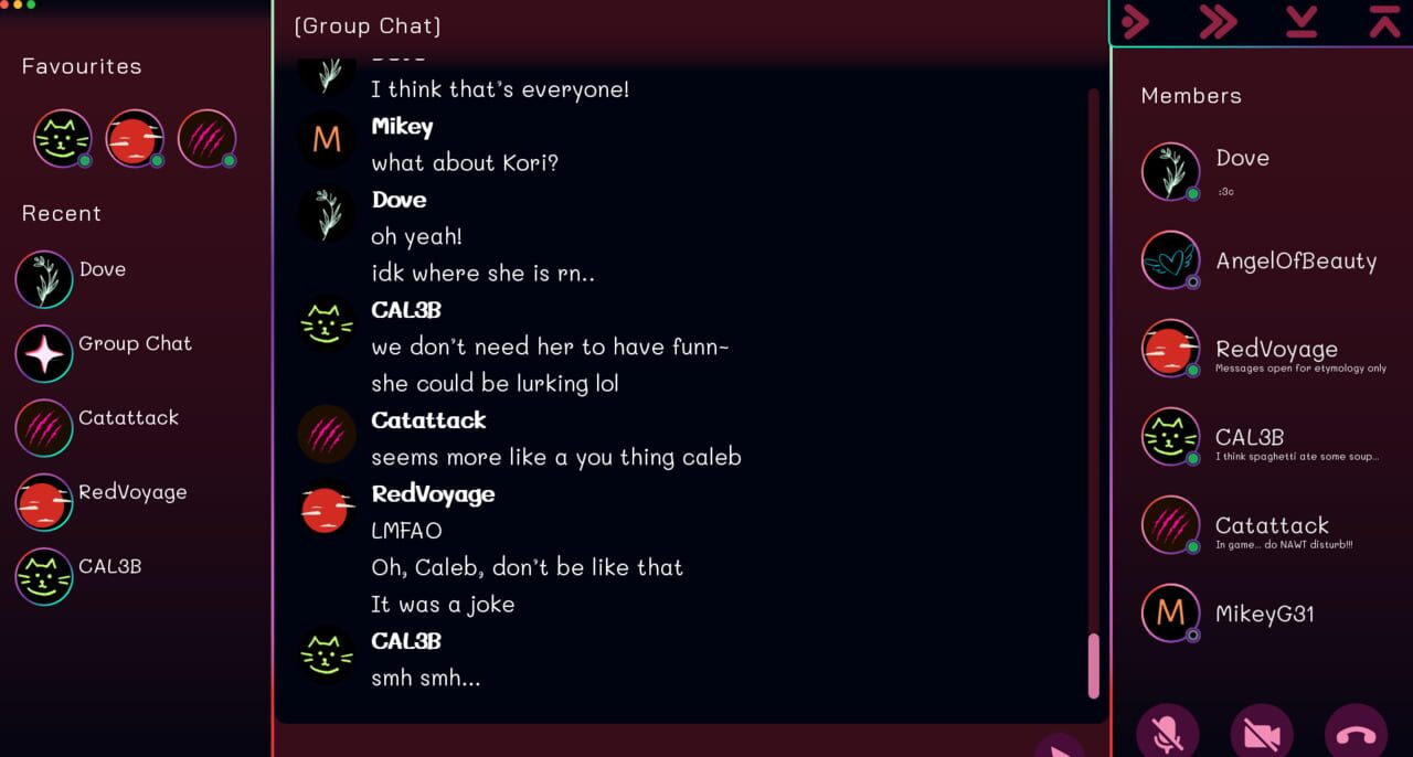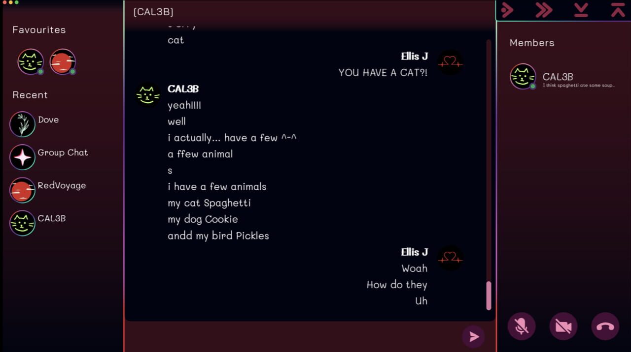 Your friend Dove invites you to a group chat to make some new friends. Everyone is so different but so friendly! They all seem so interested in you—too interested. Have fun navigating online relationships!