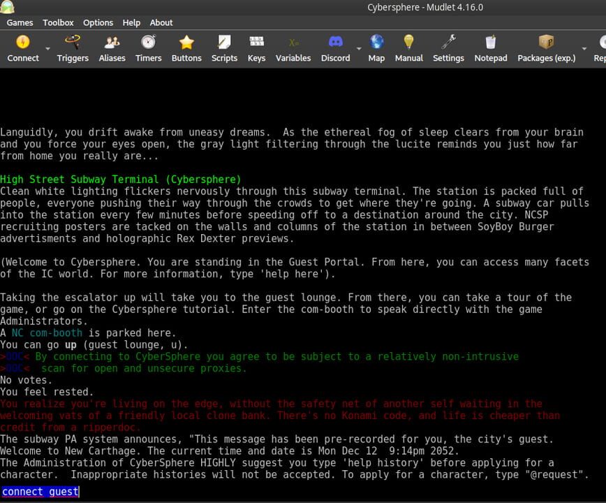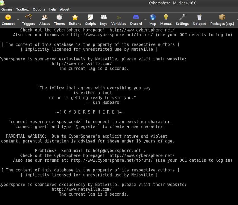 CyberSphere is a Role-Playing MOO set in a dark American future. Your virtual journey begins in New Carthage, the denizens of which range from the benign eccentric to the malicious psychotic. Shadowed alleys conceal dark secrets, and gleaming towers ...