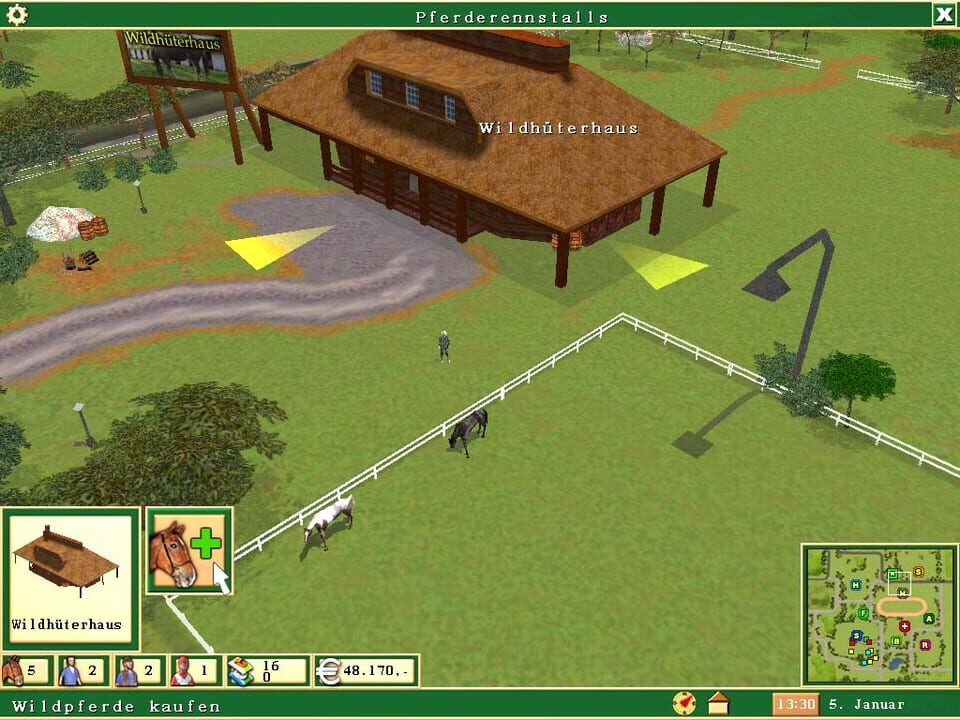 Der Pferderennstall is a real-time strategy game where you will manage a racing horses' farm by making the constructions, buying horses, hiring workers to take care of them, and observing their growth until they are prepared to race your opponents.