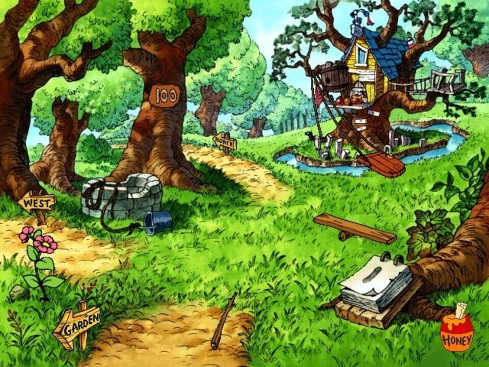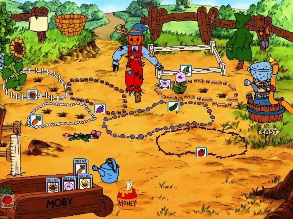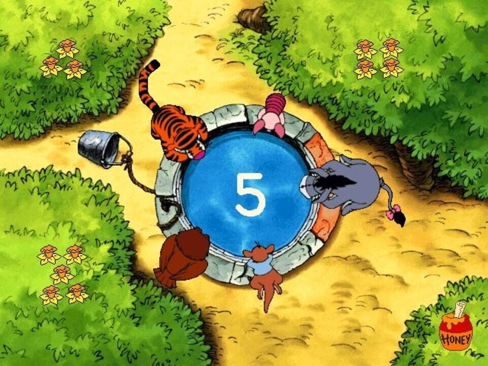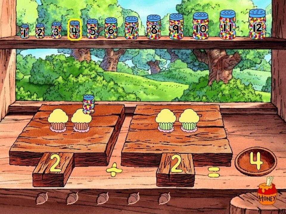When Pooh floats down to land in the Hundred Acre Wood in Disney's Ready for Math With Pooh, he comes to earth in what will become a garden as the game progresses. The player signs in on a wheelbarrow and chooses a path from the three directions give...