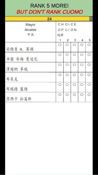 Free short web game about 2025 local NYC politics. But why should New Yorkers have all the fun? Now, through the timeless magic of video games, anyone can Don't Rank Cuomo!