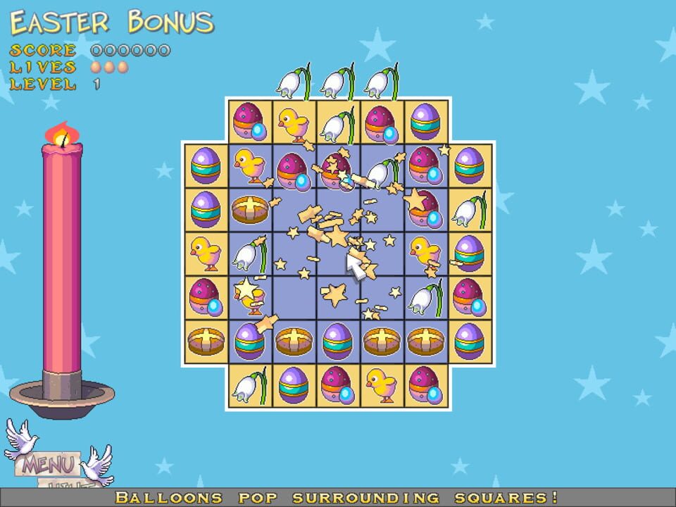 Easter Bonus is a match-three game with an Easter theme. To clear the levels, you must turn all the squares gold. You do this by making matches of three or more items over them or using bonus items. Later in the game, some squares are coated in ice. ...