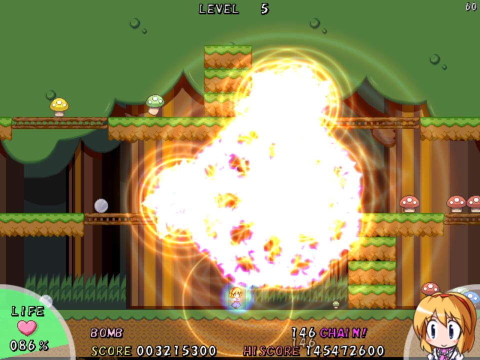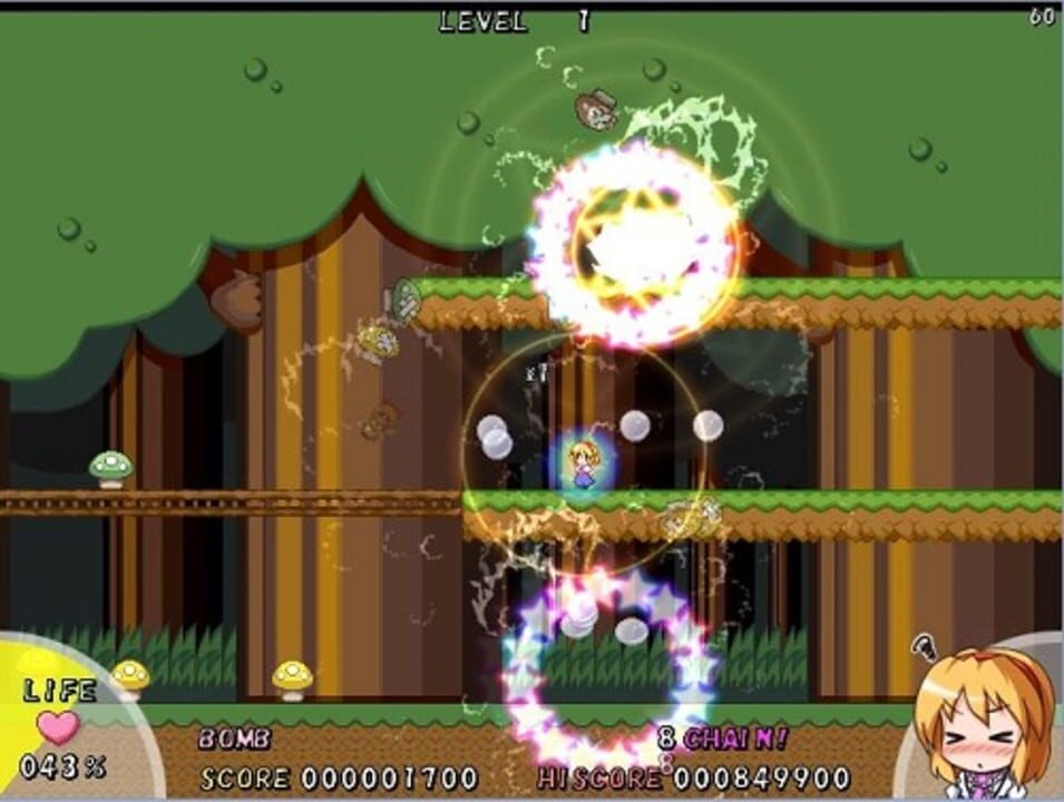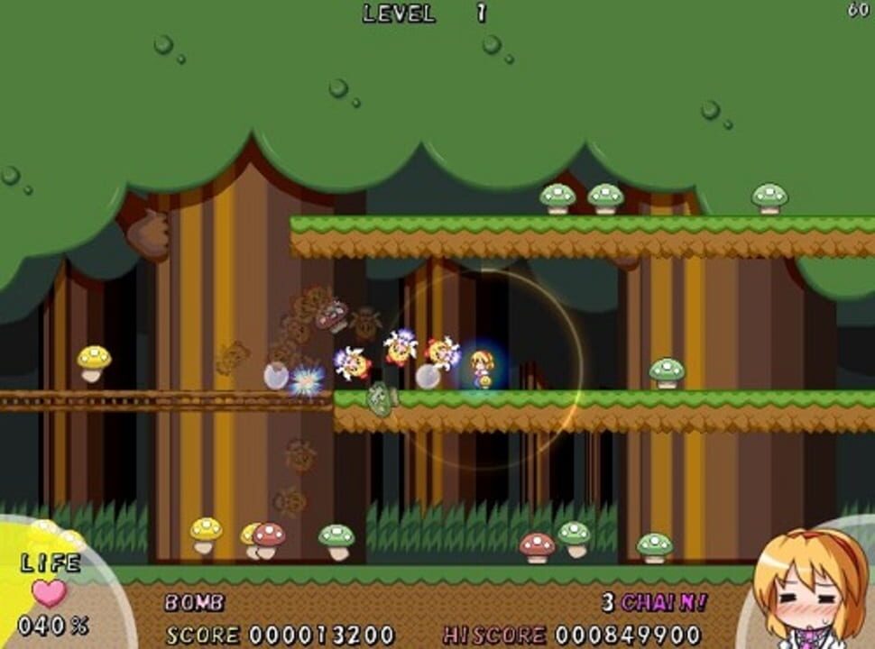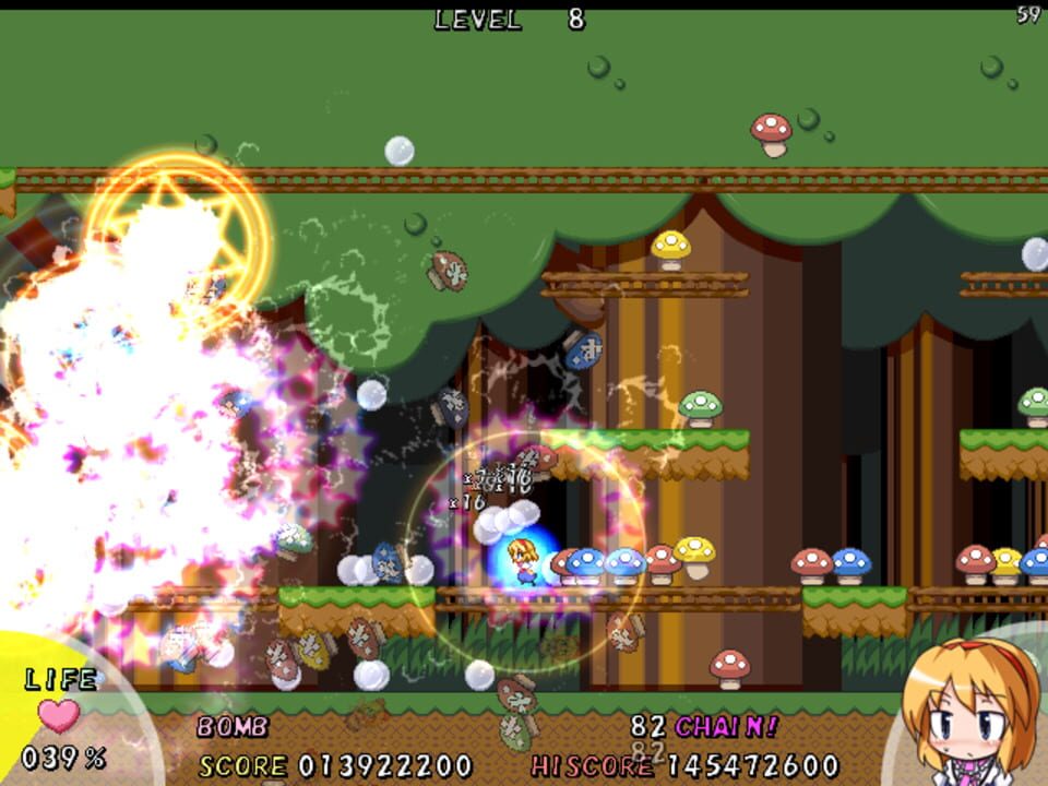 Alice Margatroid battles a slowly growing horde of mushrooms.
