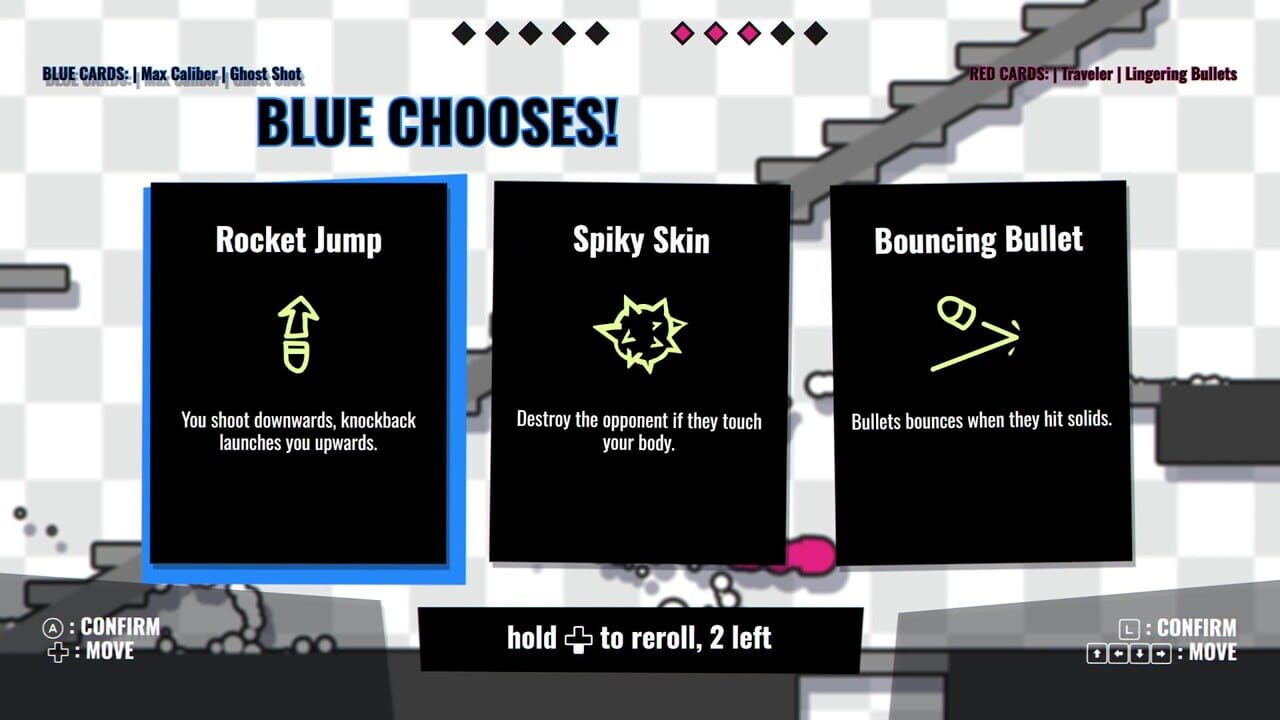Escalating Duel is local-multiplayer 1v1 2D-Arena-Shooter with deck-building elements. After each round the contestants add a card to their deck of upgrades. As the match goes on the madness escalates as the decks get thicker.