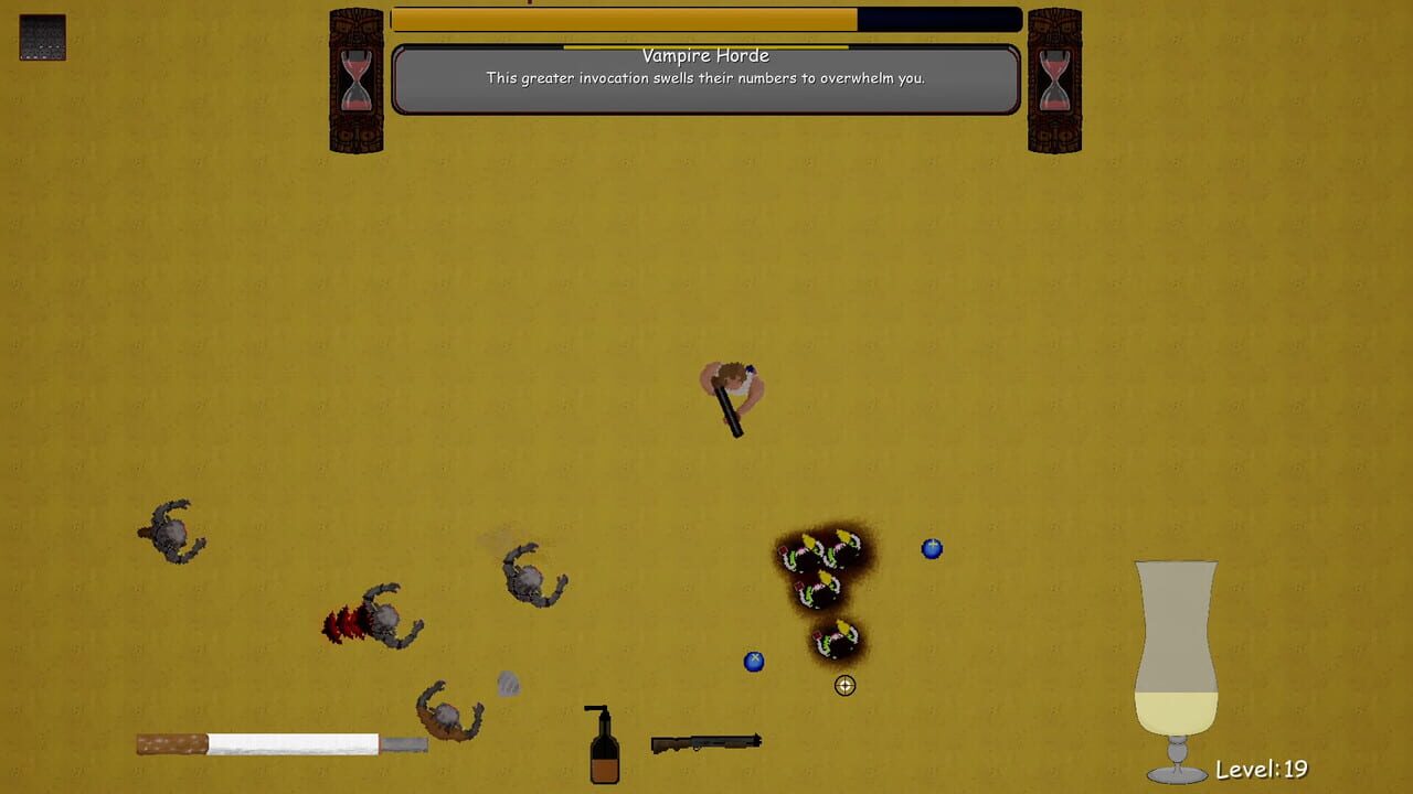 Grab your shotgun and become Florida Man in this chaotic topdown 2D roguelite shooter! Battle waves of vampires, level up, mix powerful cocktails, and push back the bloodsuckers to bring sunlight back to the Sunshine State!