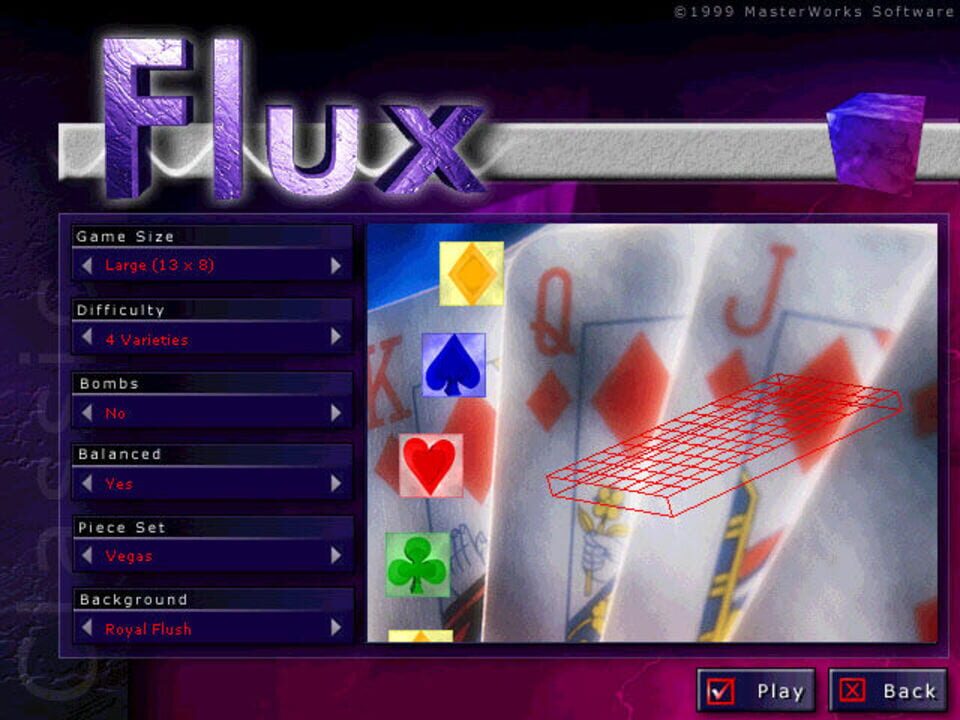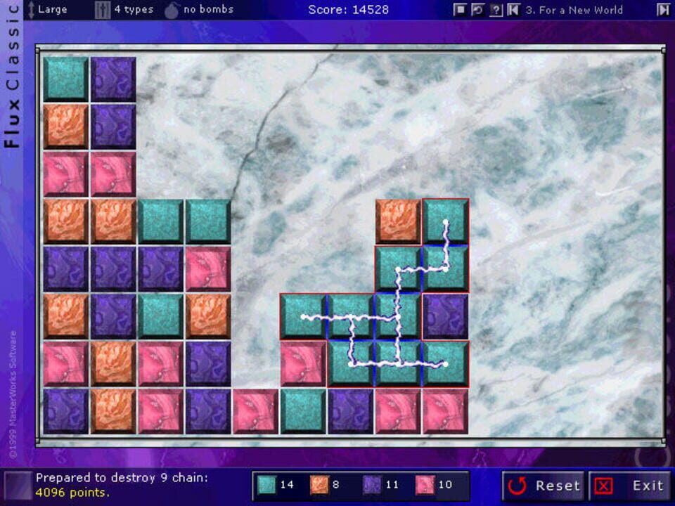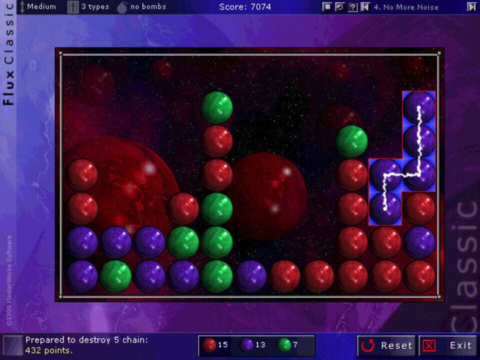 Flux is a Direct X puzzle game for Windows. It features ray-traced graphics with many options to customize the game and has a worldwide high score competition. The play field is covered with colored tiles. When tiles of the same color are touching...