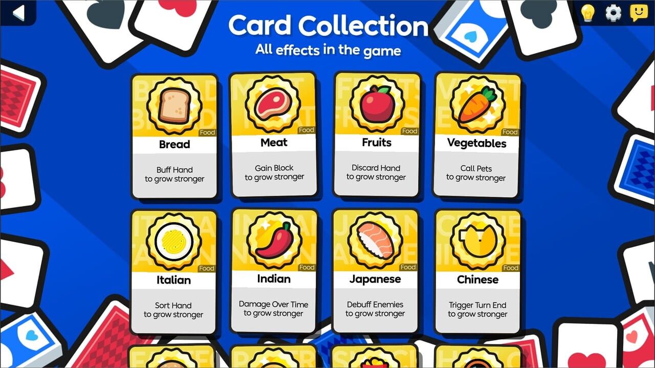 Multi-Use Cards: Eat Food to Heal, Throw them to Attack. No more dead hands! Start with 8 cards and battle through 13 challenging levels. Collect and combine over 200 unique cards to create thousands of powerful builds.