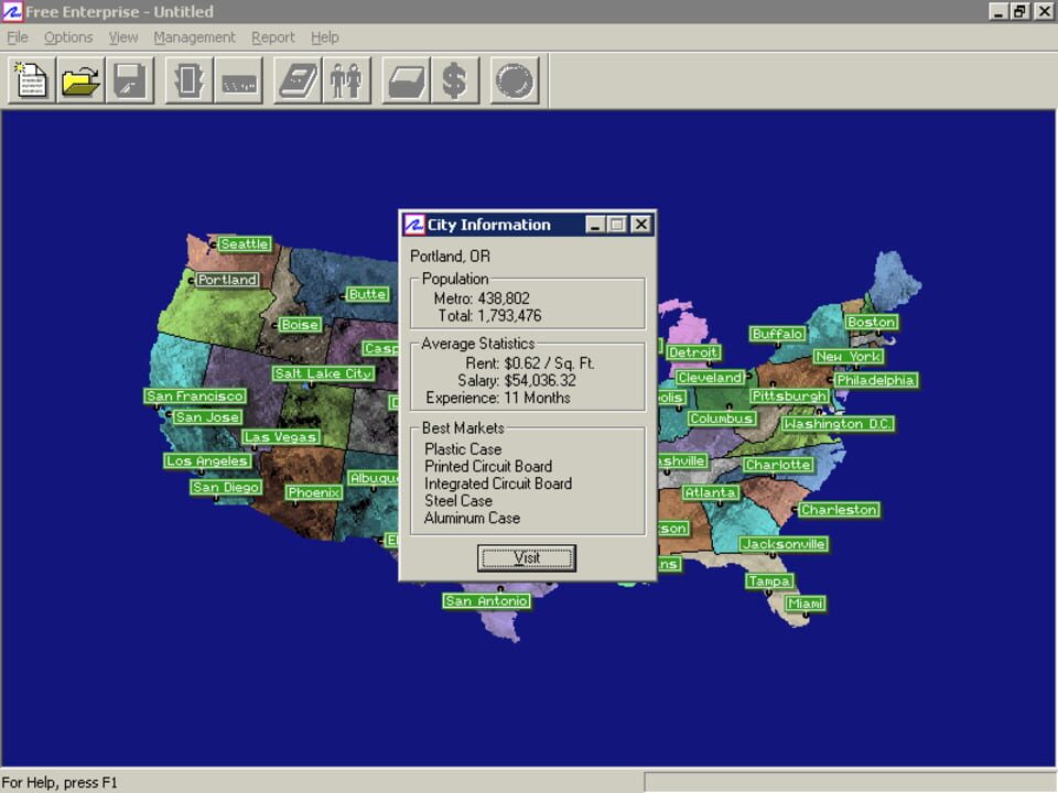 Free Enterprise is a business simulator. You get to choose your factory and then hire a unique workforce to operate machinery and carry out the orders that you assign them all done by exchanging memos. You can produce up to 100 products in your facto...