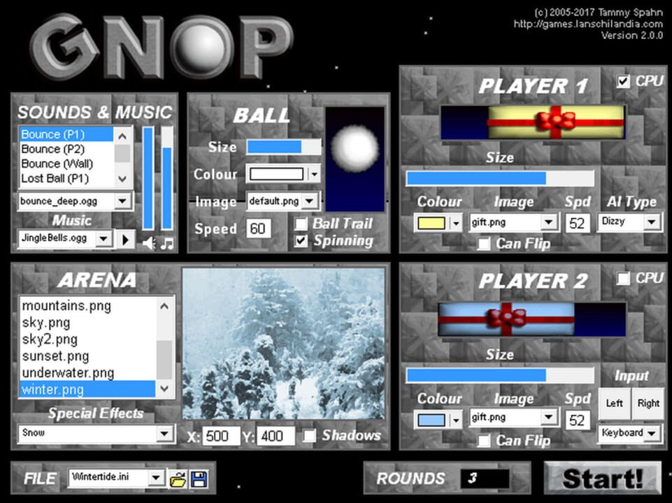 One of the world's simplest video game concepts comes to life once more in GNOP, a fully customisable game in the spirit of "Pong" for one or two players. Bounce the ball off your paddle just right to prevent your opponent from catching it, but be ca...