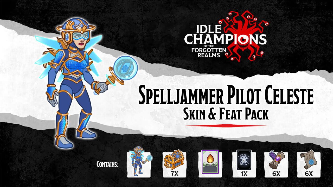 In this pack: Spelljammer Celeste Skin An Epic Feat for Celeste 7 Gold Celeste Chests 1 Guaranteed Shiny Equipment Card 6 Epic Blacksmithing Contracts 6 Epic Bounty Contracts