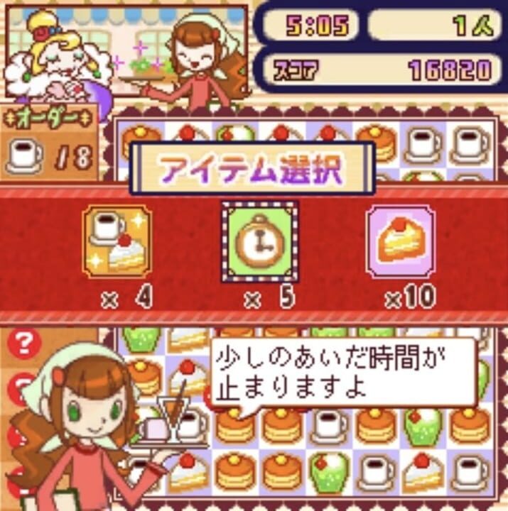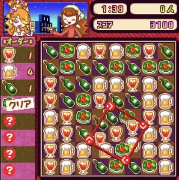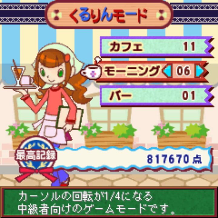 Players take control of the head bartender of the Kururin Cafe, a popular all-day spot. This puzzle game follows match-three rules using a rotation mechanic similar to Octomania. Players control a cursor the size of four tiles, and can rotate the pos...