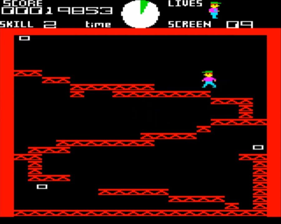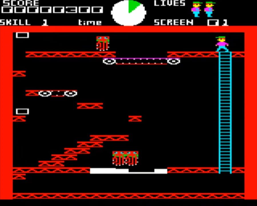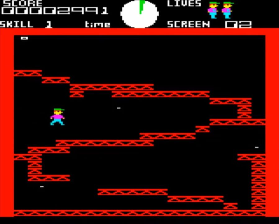 Ledge Man can jump, move left and right, and climb up and down ladders. He must jump between platforms, trying to collect all the flashing gems on each stage. Conveyor belts and moving platforms add to the difficulty. The umbrella can help him safely...