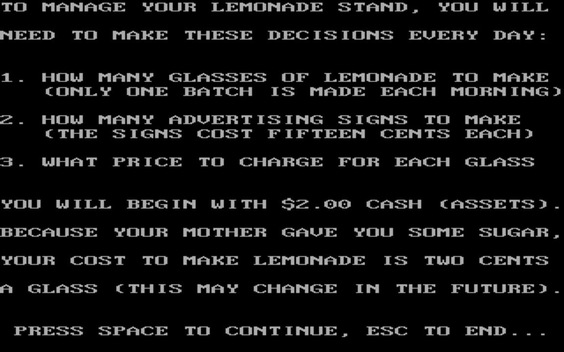 Lemonade Stand is a business simulation game created in 1973 by Bob Jamison of the Minnesota Educational Computing Consortium. Charlie Kellner ported the game to the Apple II platform in February 1979. Throughout the 1980s Apple Computer included Lem...