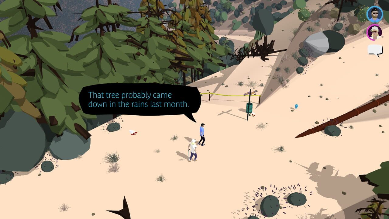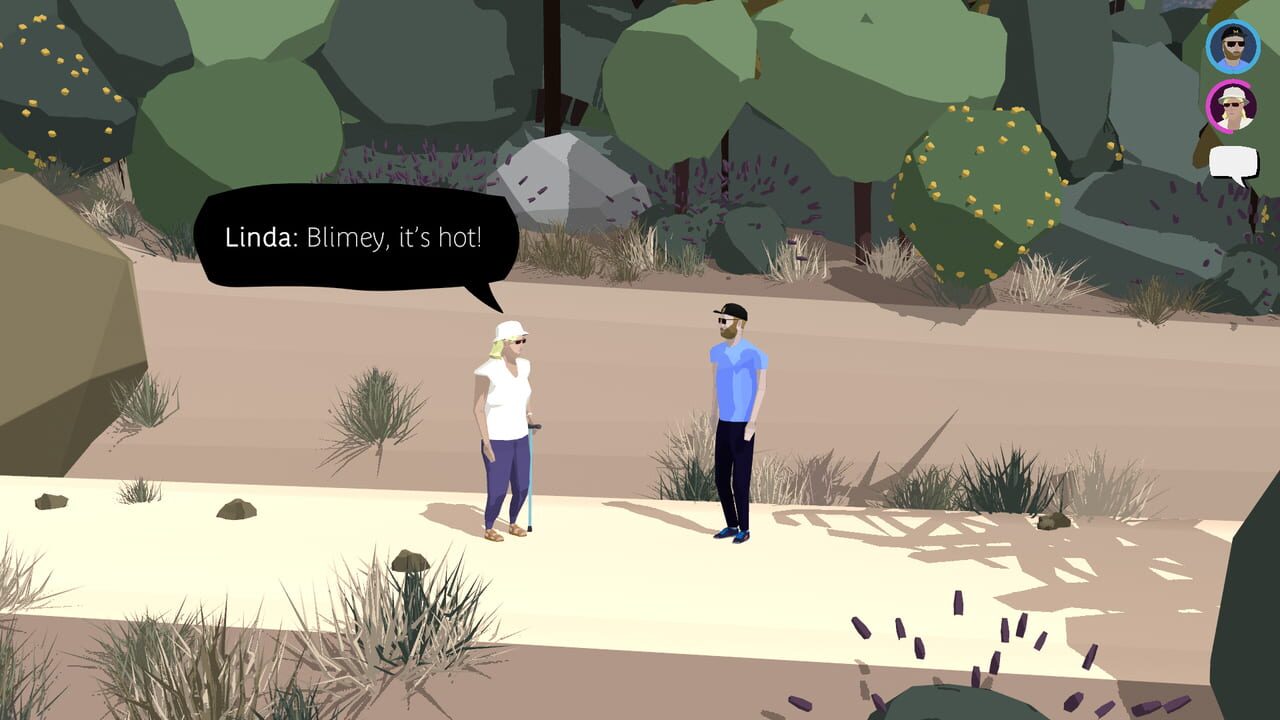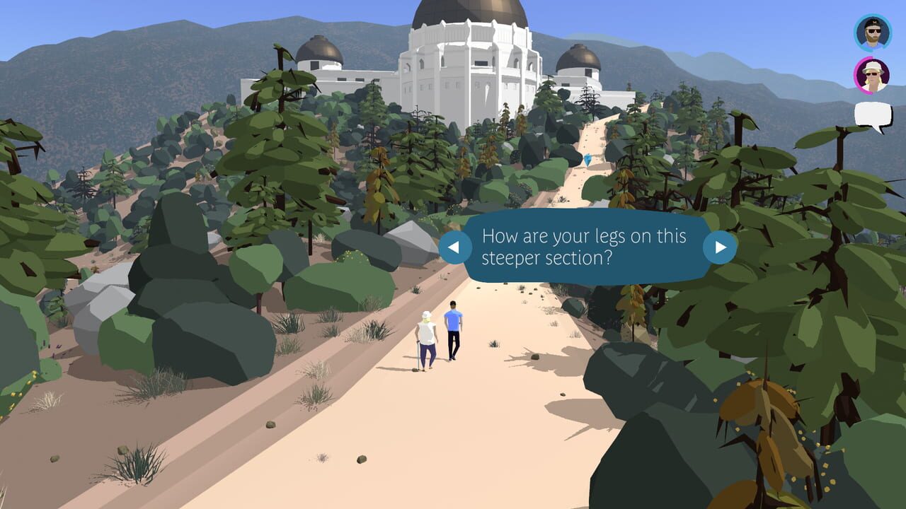Linda is visiting Russell in Los Angeles, where he now lives. We join them halfway up a hiking trail. You must walk them to the top. Linda is using a stick and is unable to move as quickly as Russell....