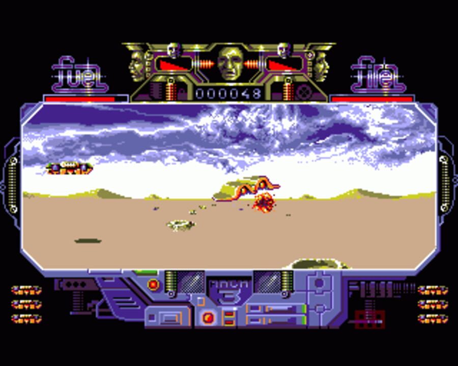 Players control a spaceship in this pseudo-3D shoot 'em up.