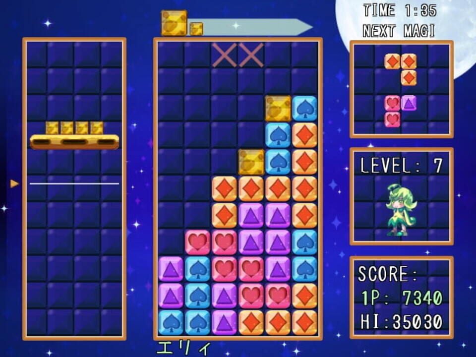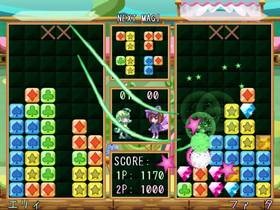 "Magipon!" is a puzzle game where the player scores by combining five Magi blocks of the same color. Blocks will not automatically clear once five blocks have been linked. Instead chained blocks can be clear by setting a magic circle on the final blo...