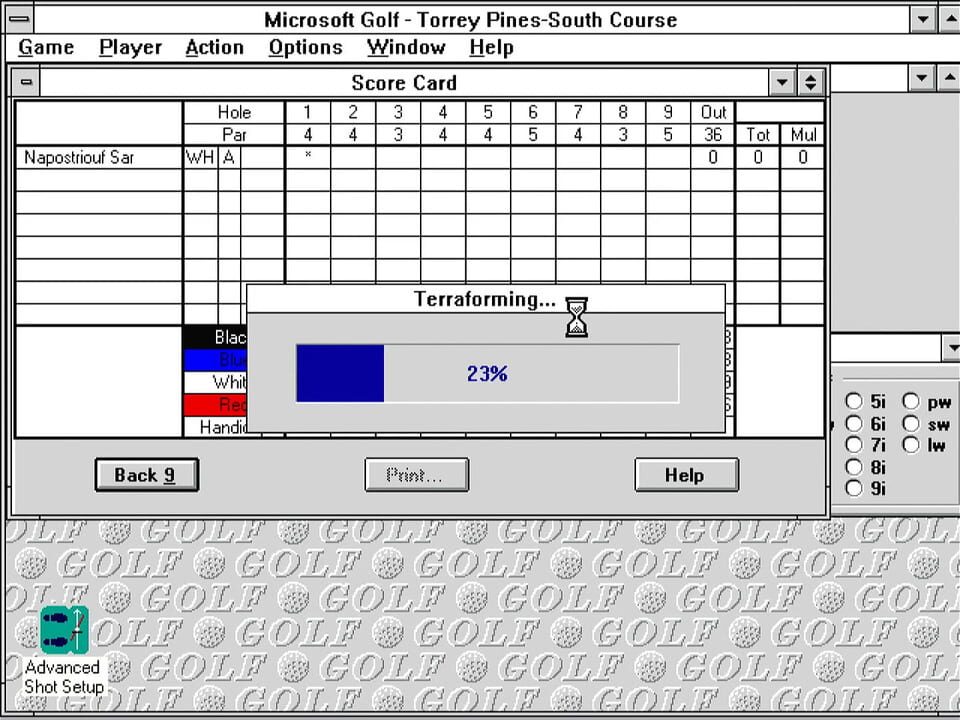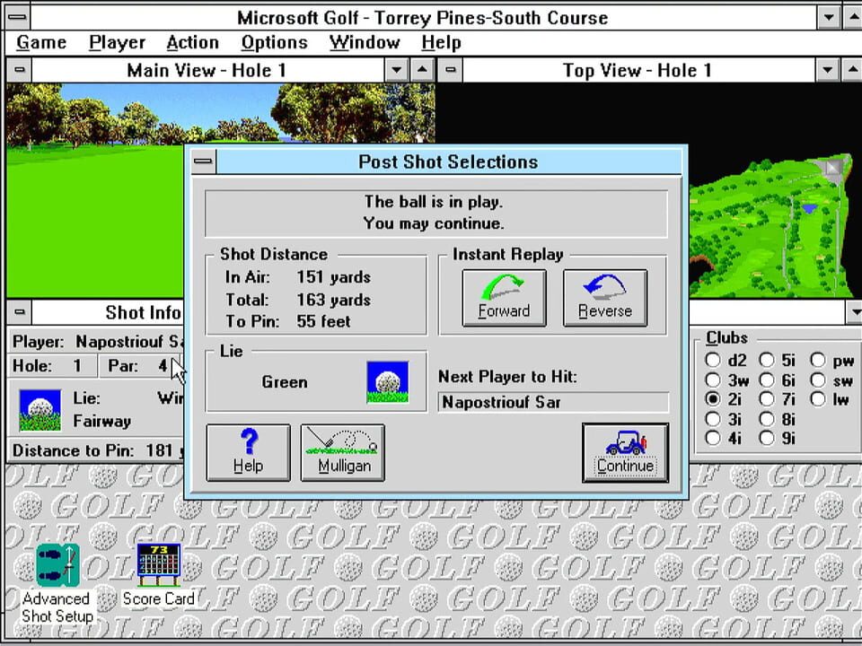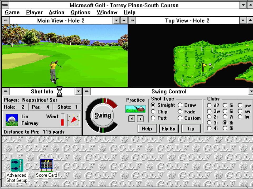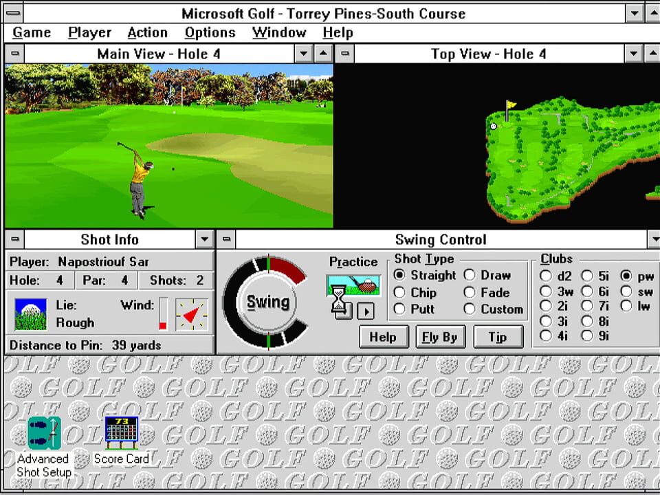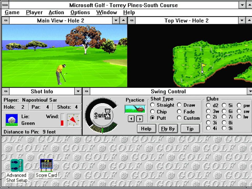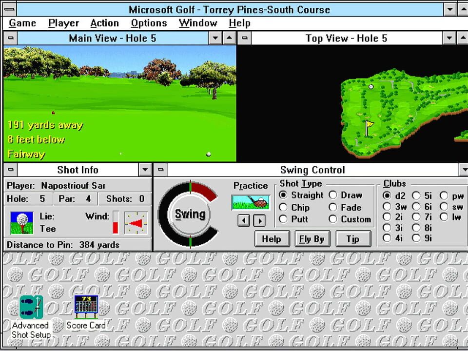 Microsoft Golf is a golf simulation game based on the Links. You have 18 courses you can play. You also have the ability to change to numerous different clubs and type of shots depending on the wind and terrain.