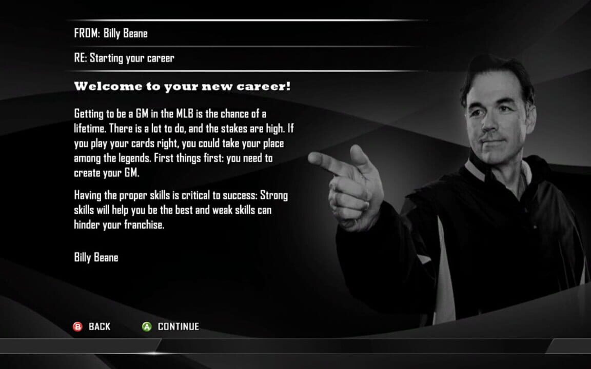 MLB Front Office Manager allows a player to take the role of a baseball general manager over the course of a thirty-year career; the goal is to perform well enough to become inducted into the Baseball Hall of Fame. The player's GM is rated on eight d...