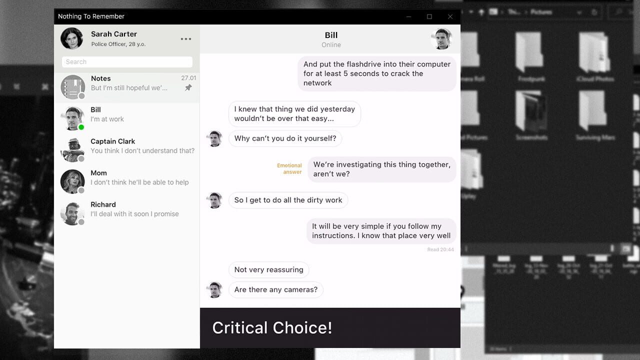 Nothing To Remember is an immersive murder mystery that runs in real-time, right on your desktop. Through their personal messages, you'll uncover two characters unknowingly intertwined as they hunt a killer long thought dead. When your next choice co...