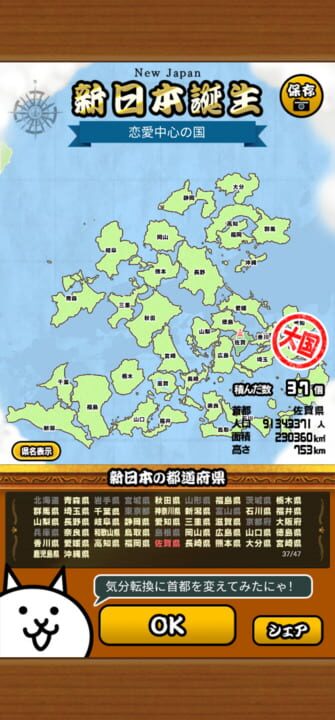 Released to celebrate the 8th anniversary of The Battle Cats. Puzzle game where you stack Japanese prefectures on top of each other to create a New Japan.