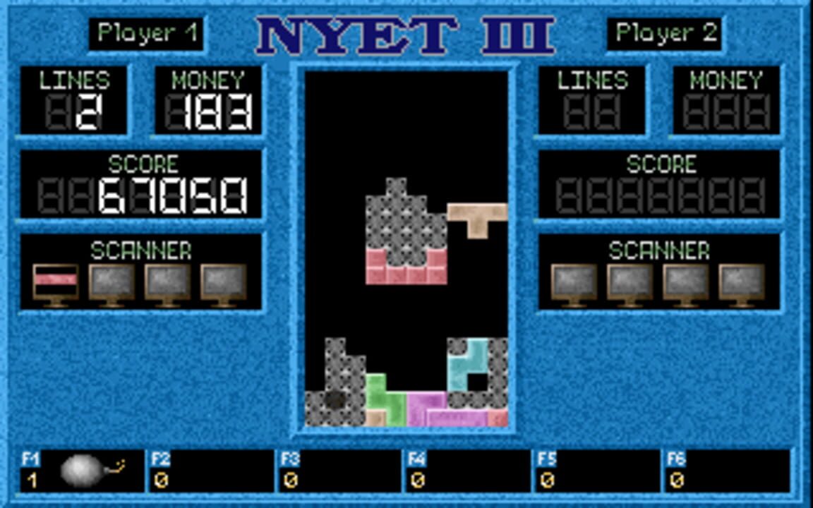 Nyet 3: Revenge of the Mutant Stones is a Tetris variant written by Proline software. It consists of upto 108 stages, all based on the Tetris ruleset. The objective is to clear a set number of lines within the stage, but each has a twist in the rules...
