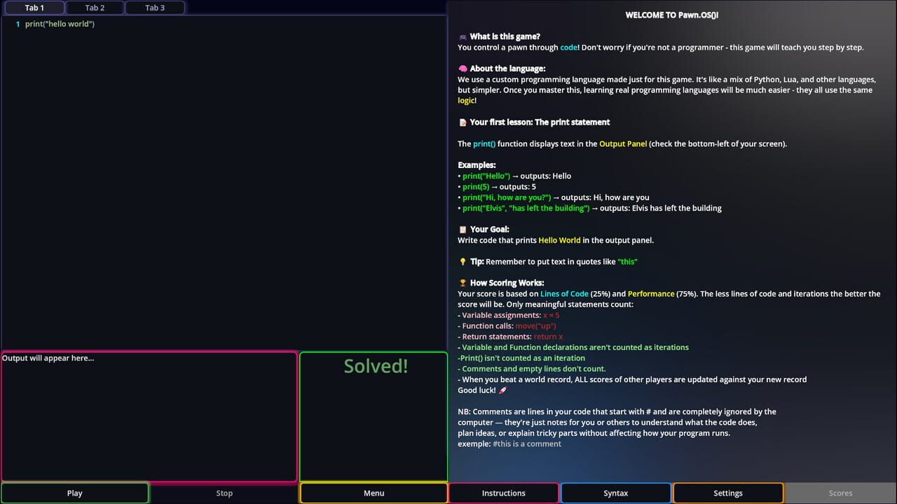 Pawn.OS() is a programming puzzle game where you use a custom scripting language to control a pawn on a grid. Solve 30 puzzles, learn logic step-by-step, and optimize your code to climb the leaderboard—even without any prior coding experience.