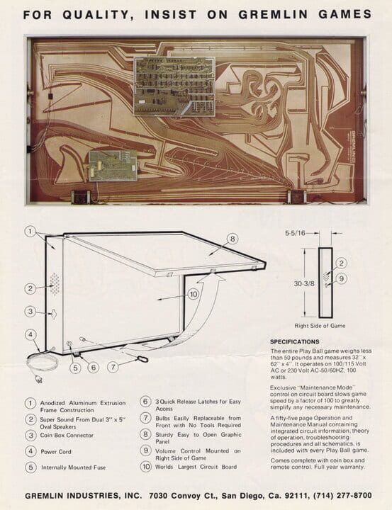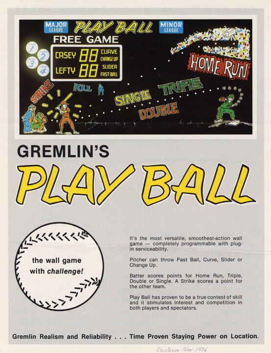 Play Ball was produced by Gremlin in 1972. From flyer: "It's the most versatile, smoothest-action wall game - completely programmable with plug-in serviceability. Pitcher can throw Fast Ball, Curve, Slider or Change Up. Better scores points for Ho...