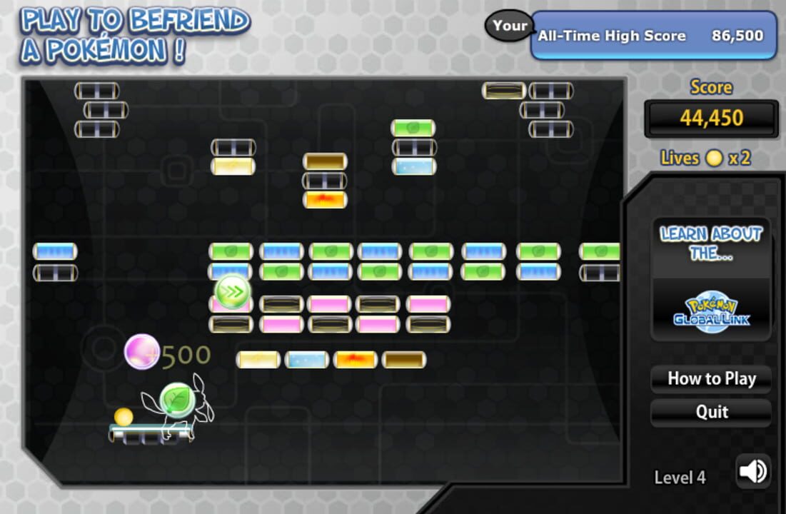 Play to Befriend a Pokémon! was a Flash game formerly available on Pokémon.com. It was a Pokémon Global Link promotion. The goal is to break blocks with a bouncing ball, similar to Breakout. Players use the paddle to keep the ball from falling out of...