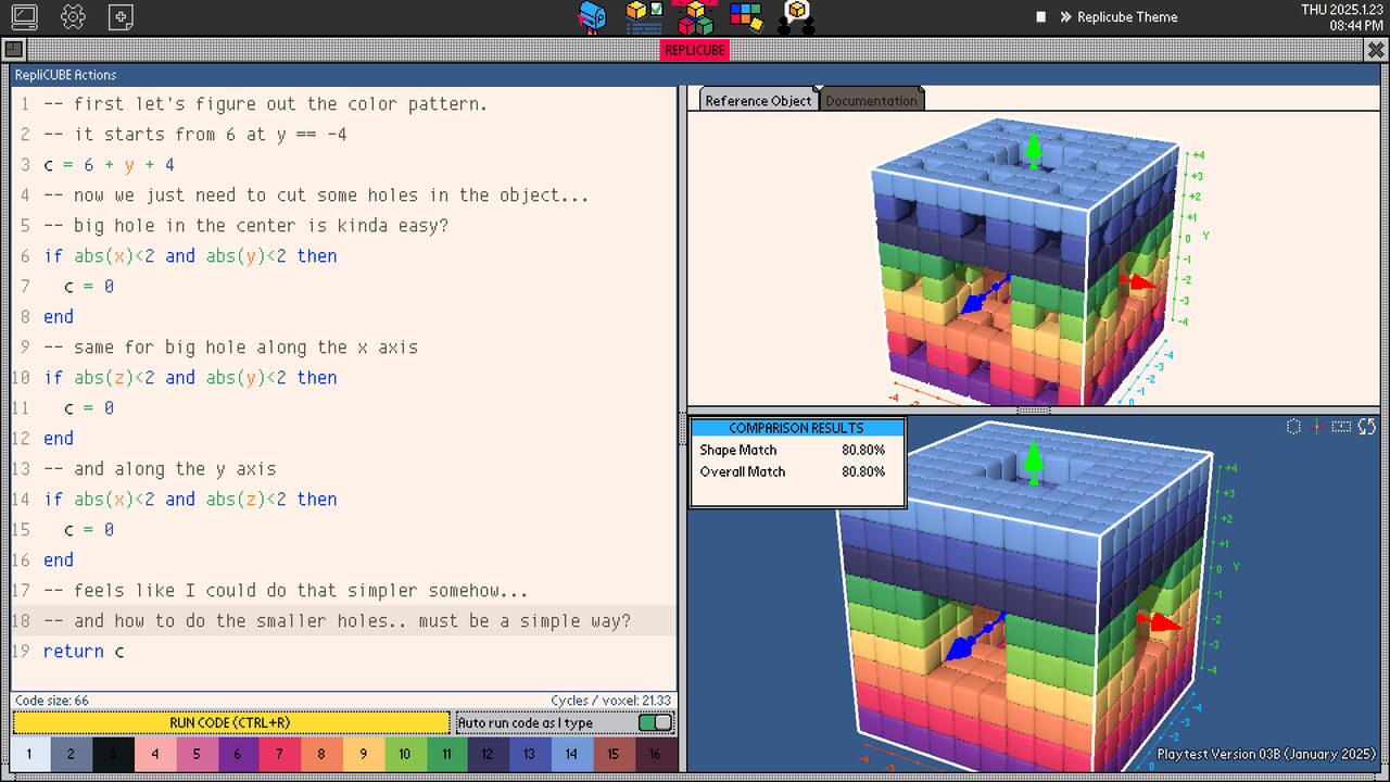 Replicube is an open-ended programming puzzle game/toy about writing code to replicate 3D voxel-based objects. Solve puzzles, pursue leaderboard glory, or just make art to share with the in-game community.
