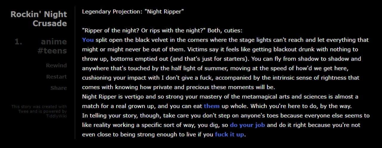 In Rockin' Night Crusade you're a magical (girl/boy/whatever) out to protect our glorious culture and the American way from devils so the grown ups can have less distractions…