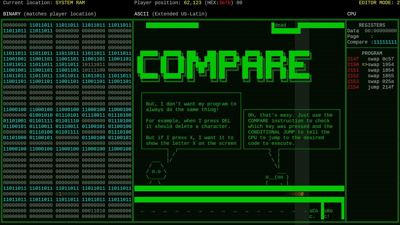 A single bit of computer memory became sentient and decided to escape from digital into the real world. Explore RAM, modify bytes and hack machine code and CPU registers to set it free.