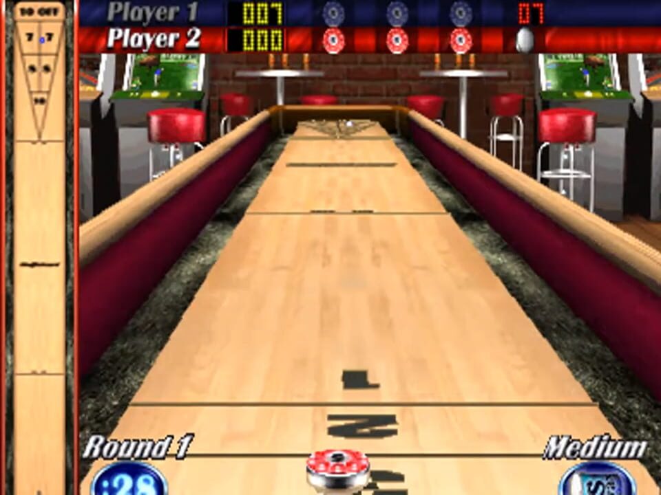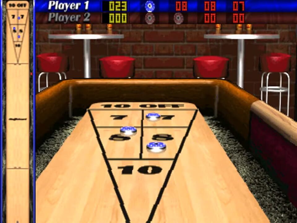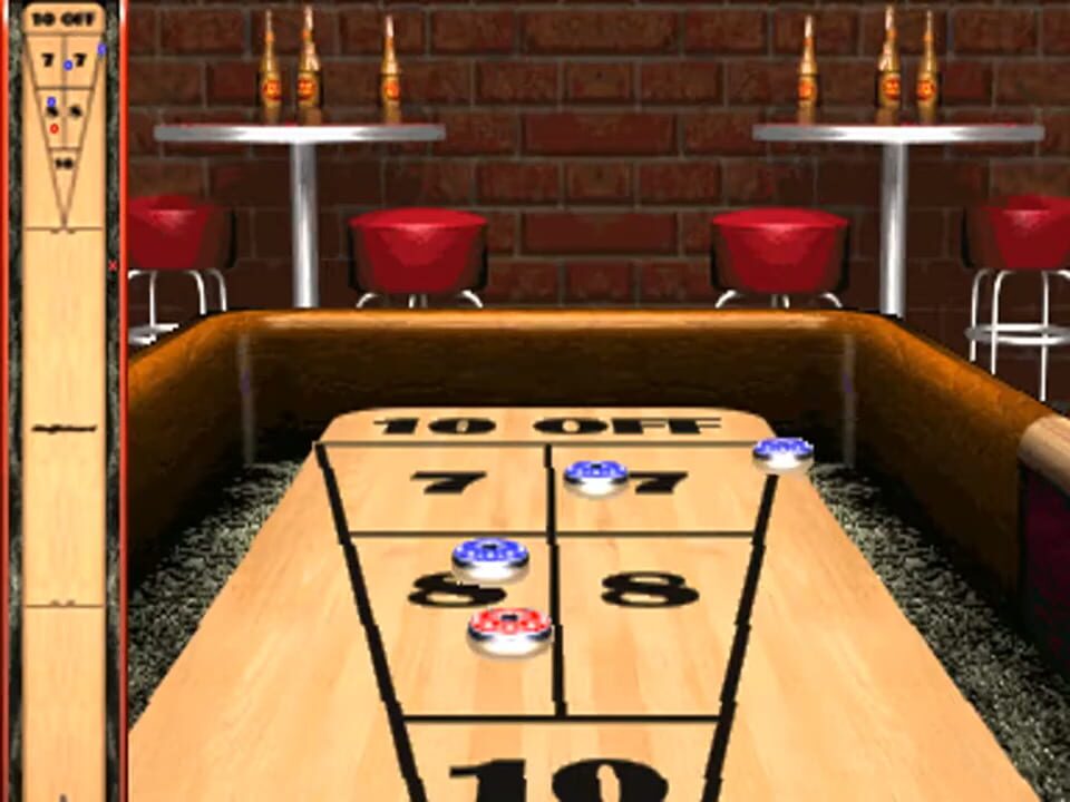 Shuffleshot is an arcade game where over a series of turns players glides weights across the board into a scoring field trying to earn the most points without going off the board.