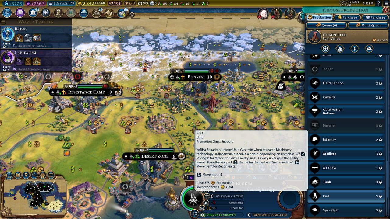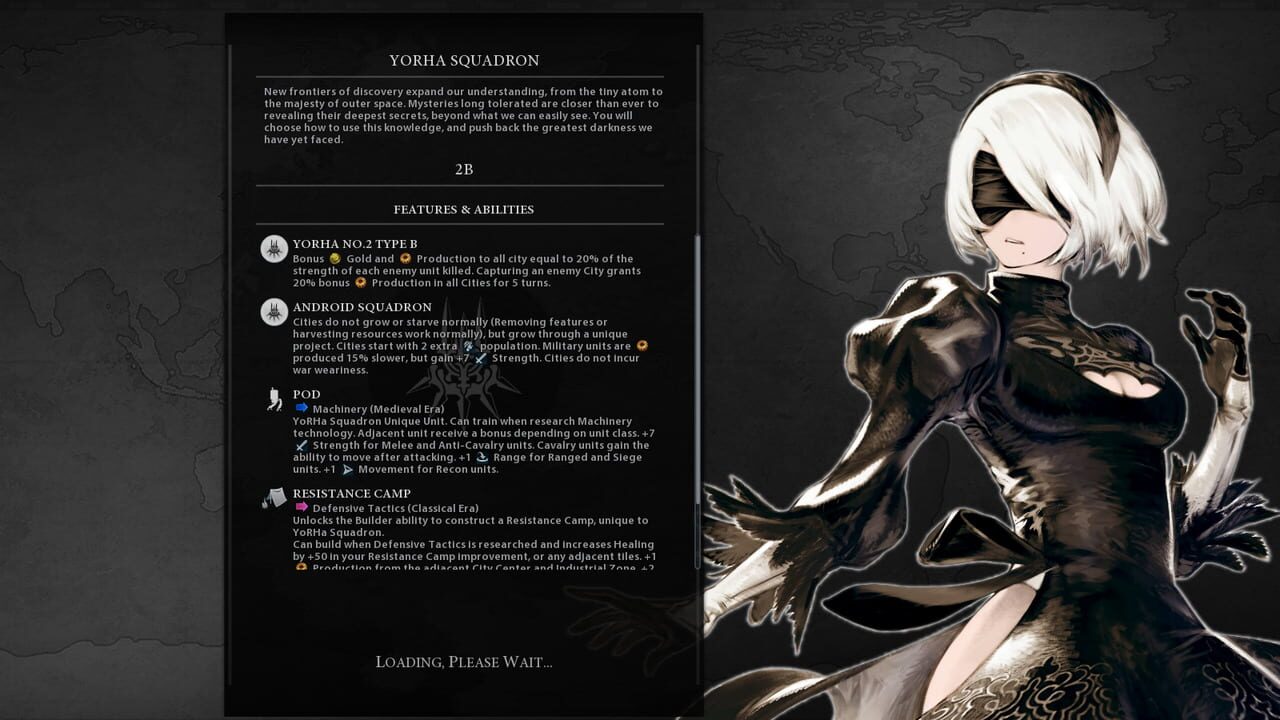 A mod that adds 2 leaders, alongside the Yorha Squadron civilization. 2B as a leader gains production based on the strength of enemies killed, and gains a bonus yield % too all cities when capturing one. White gains a bonus production per trade route...