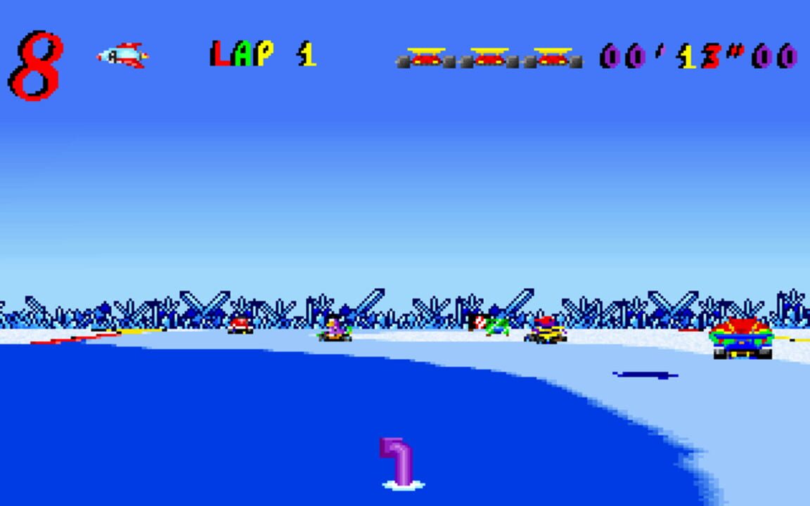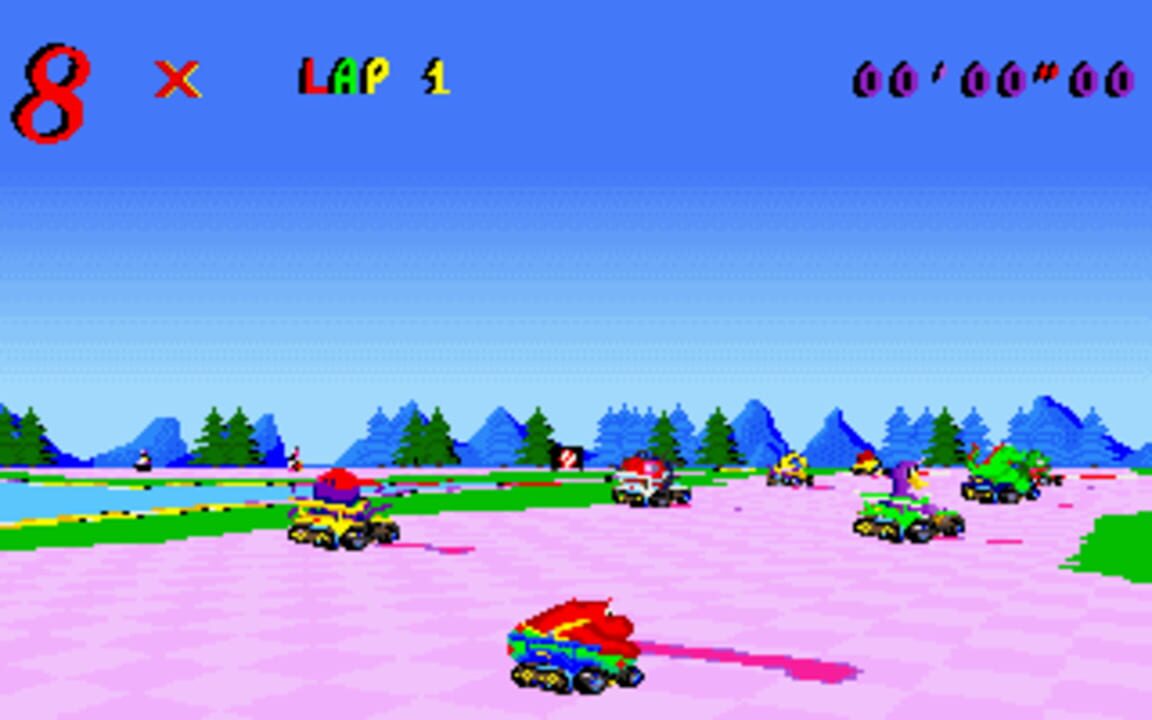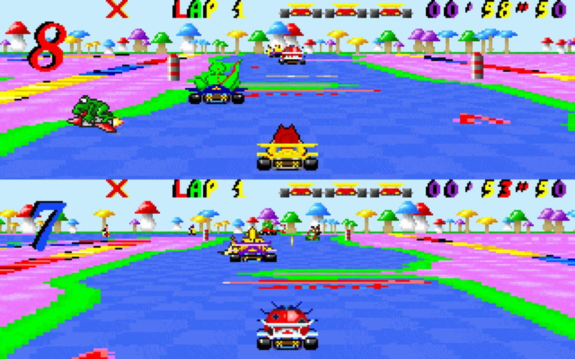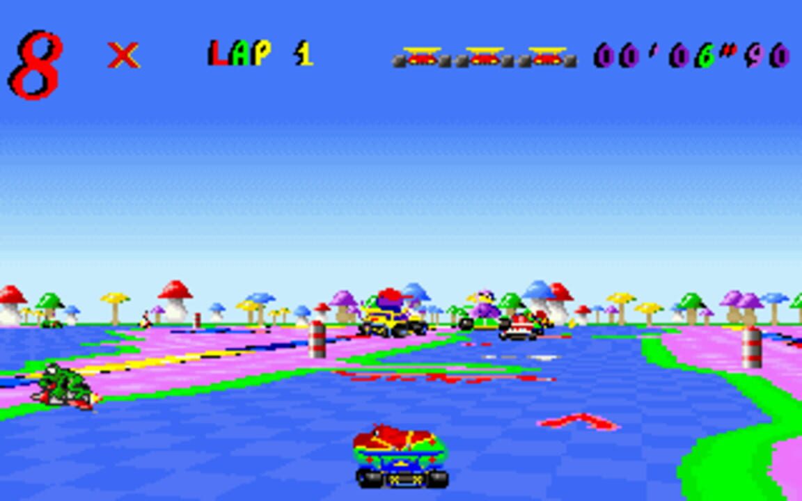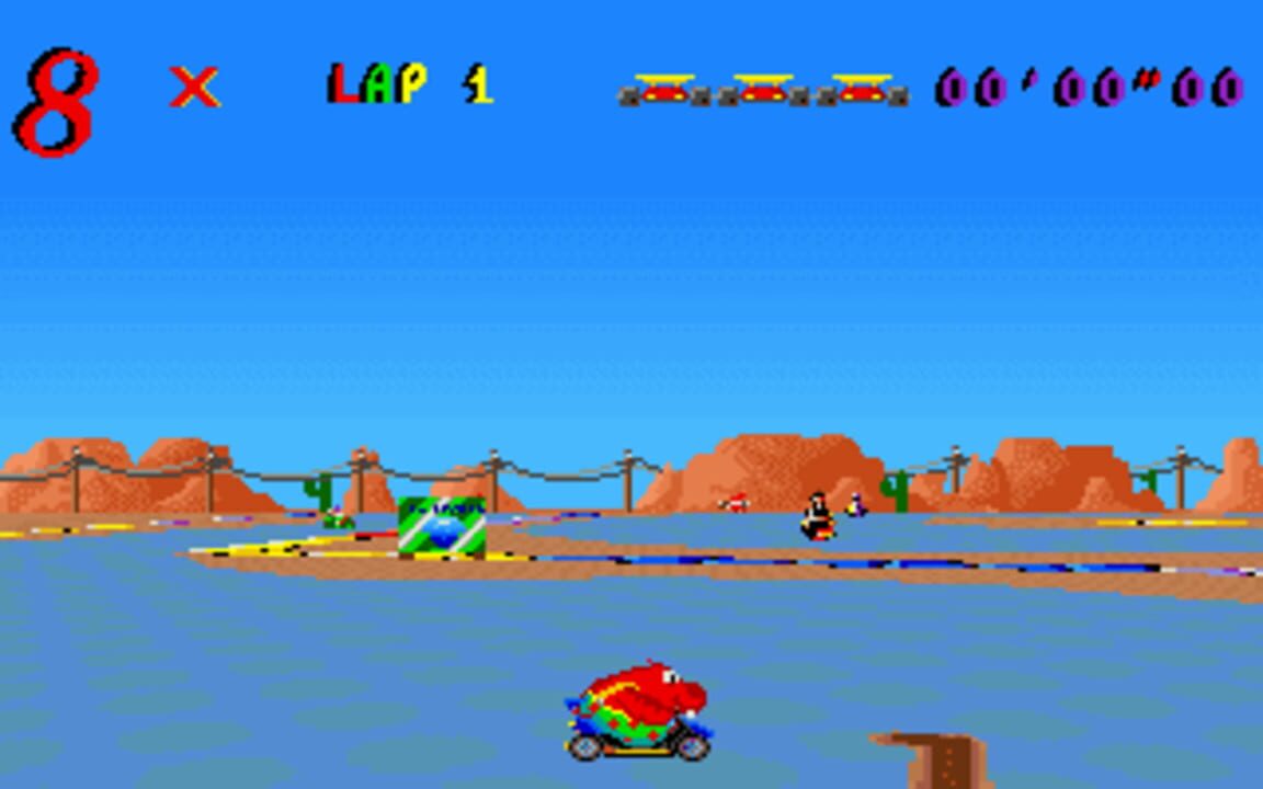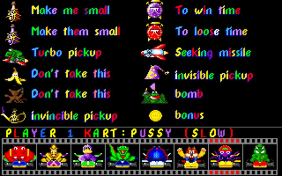 Skunny Kart plays much like Mario Kart for the SNES. The player races around the track trying to finish the race in first place. Along the way there are traps scattered around the tracks as well as some power ups. There are many sound effects used th...