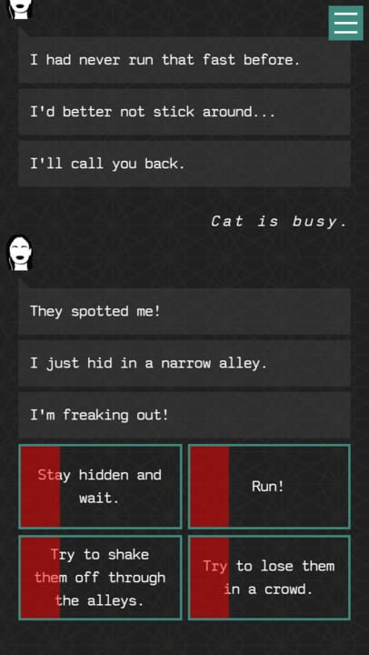 You are tasked with helping Cat, a culture journalist caught up in a whistleblowing case. She reaches out to you via text message, and your job is to guide her through a series of challenges and situations to help her investigate and...stay alive! Se...