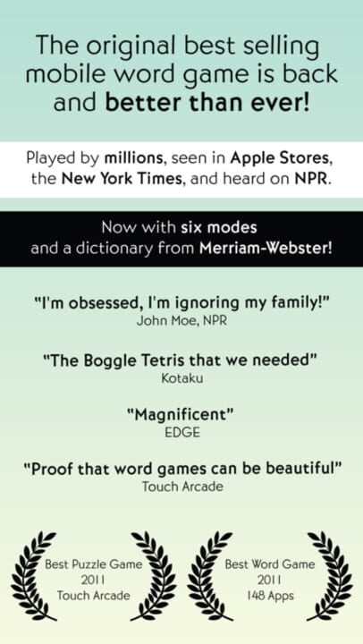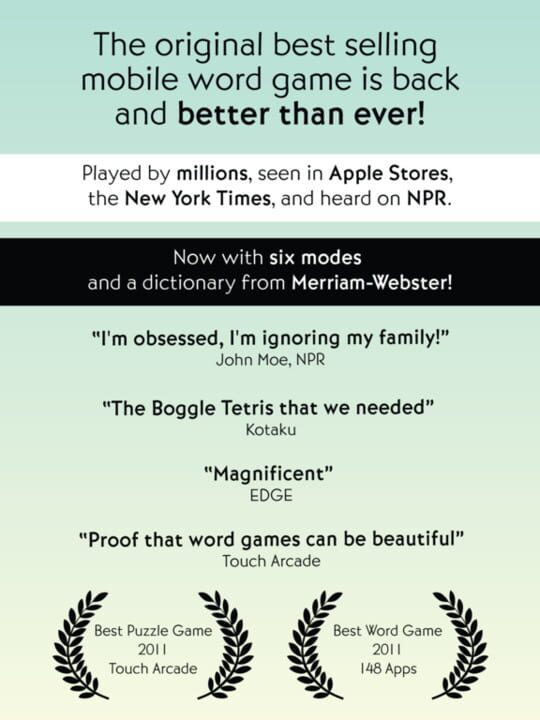 A word puzzle game for iOS, Android, and Mac. Swipe letters to create words in four gameplay modes.