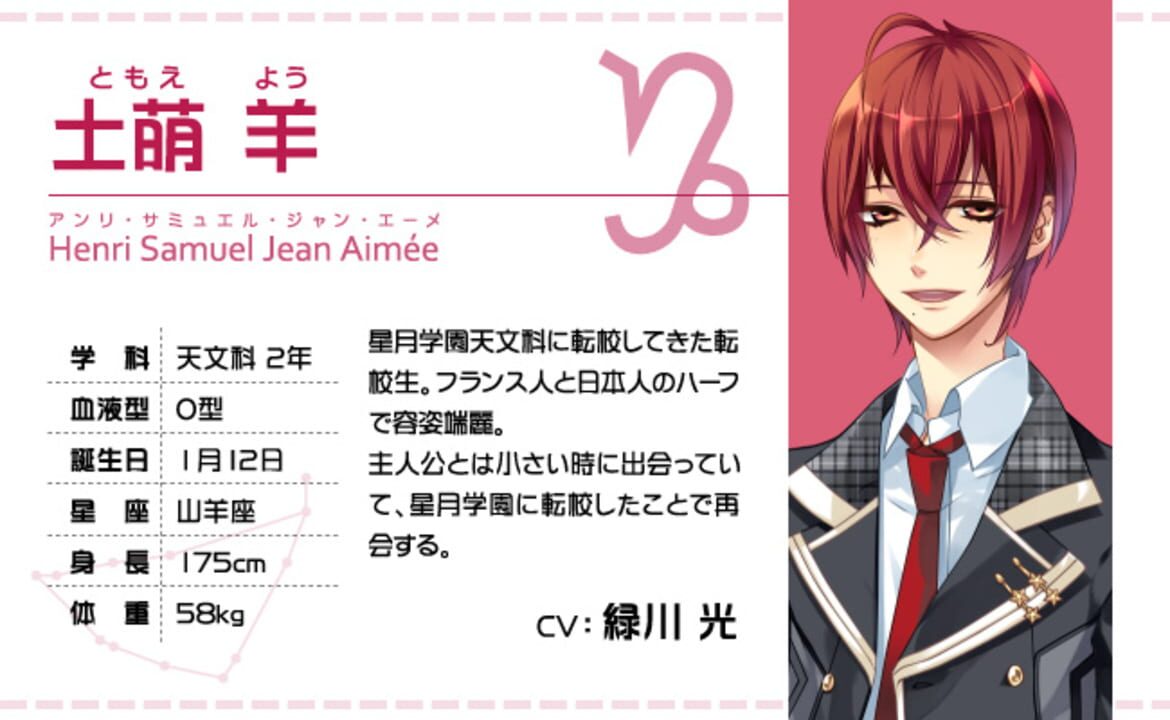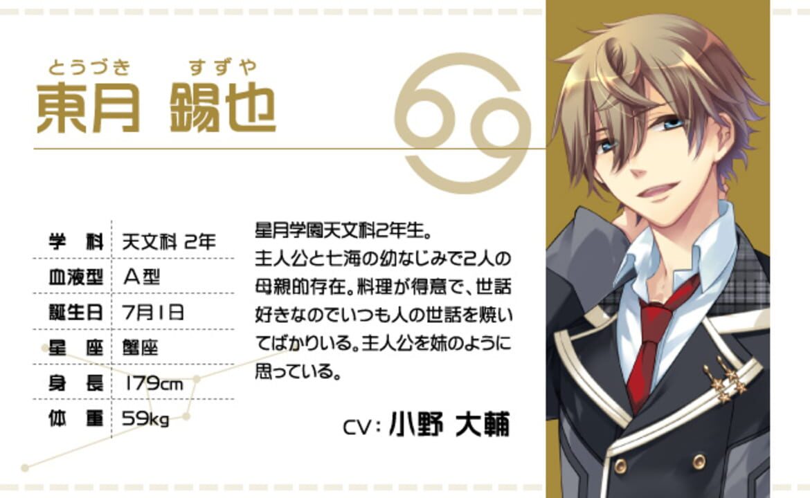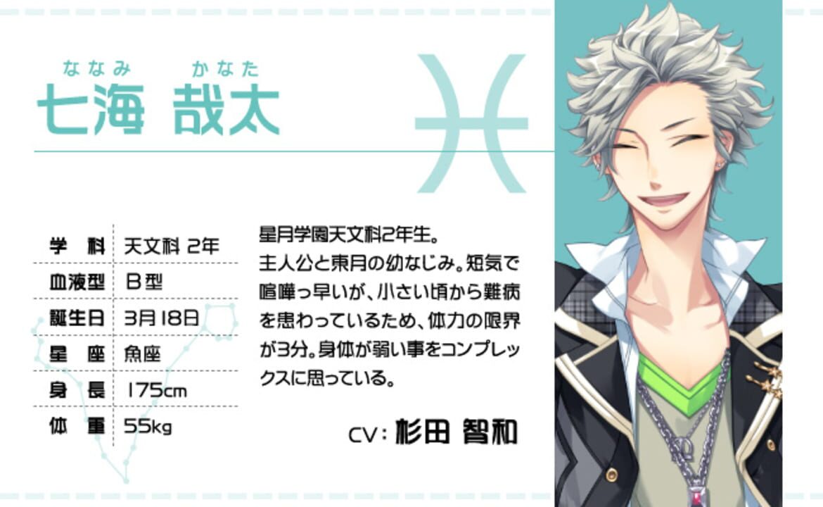 Starry Sky Spring features Suzuya Tohzuki (Cancer), Kanata Nanami (Pisces) and Yoh Tomoe (Capricorn). It follows main character Tsukiko Yahisa, who's the first girl to enroll in the school, and her fi...