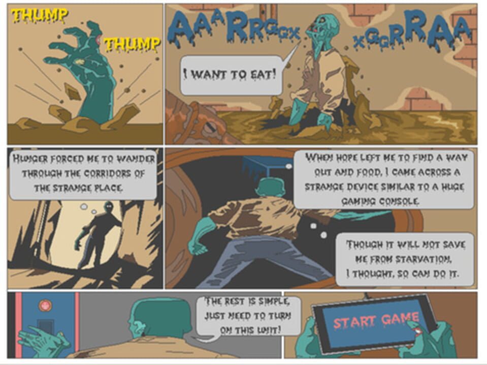 Starving is a great story about a deceased person called a zombie, who started to look for food in a strange place in which he found himself under unclear circumstances.