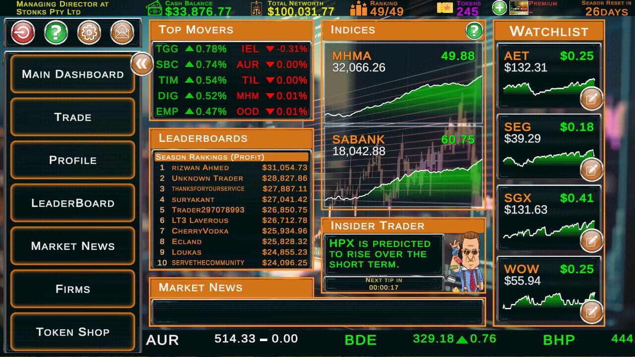 A competitive multiplayer real-time stock market investment game where players compete globally to achieve maximum investment returns. Trade live stocks in a simulated economy and manage your portfolio in a real-time virtual stock exchange.